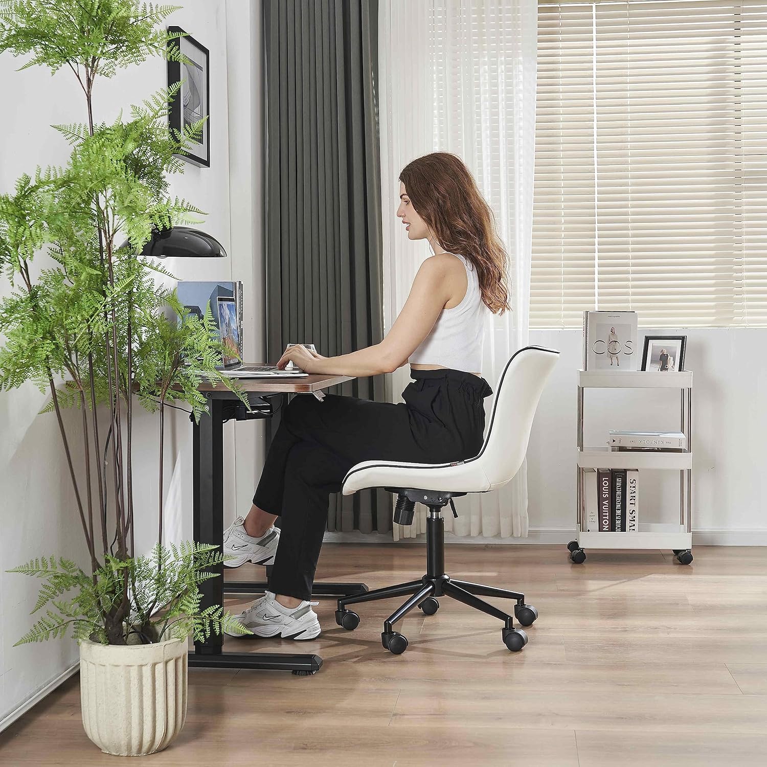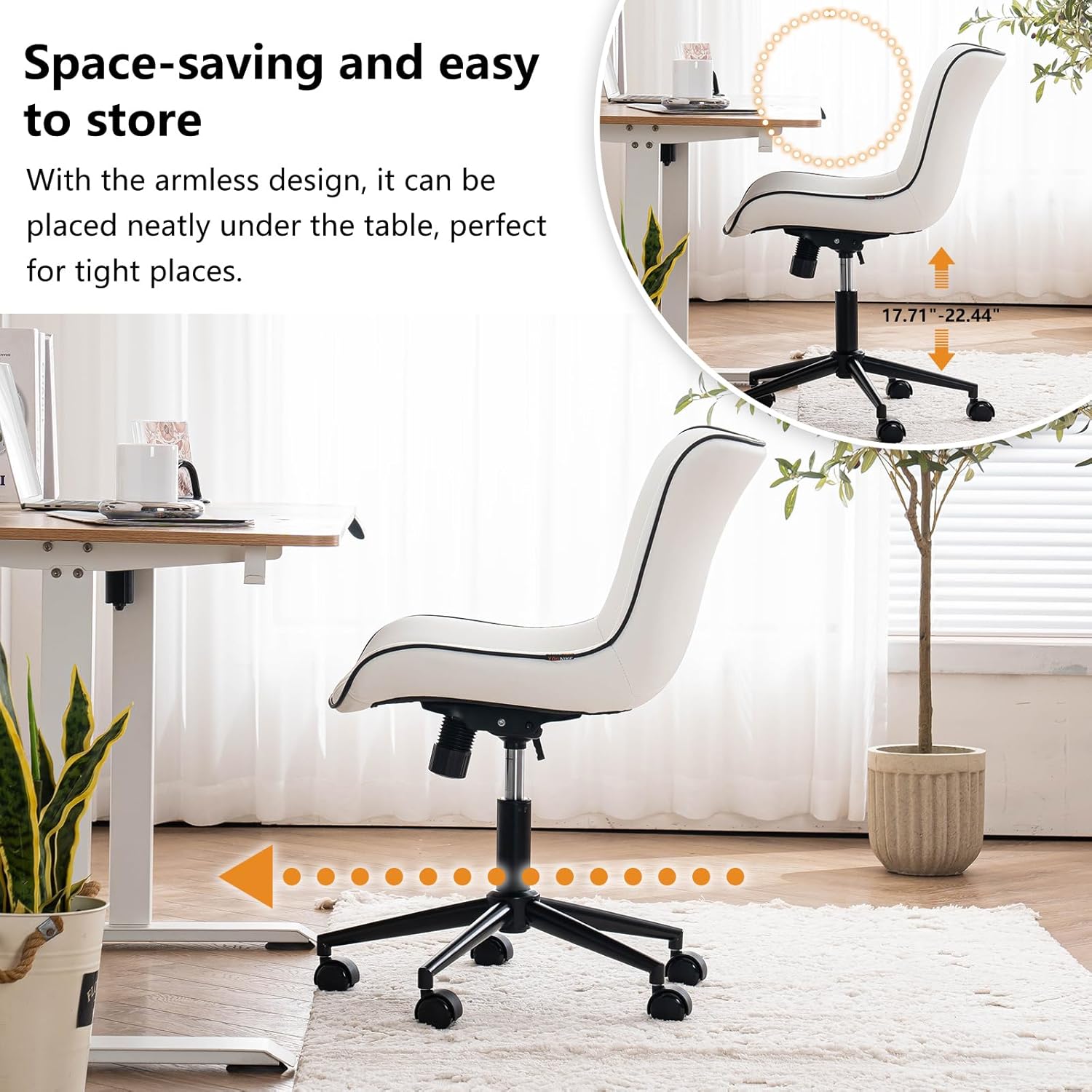 YOUNIKE Home Office Desk Chair with Wheels Armless Vanity Chair with Back Comfy Modern Leather Upholstered Rolling Task Chair Swivel Small Cute Computer Chair No Arms Wide Adjustable Ergonomic White