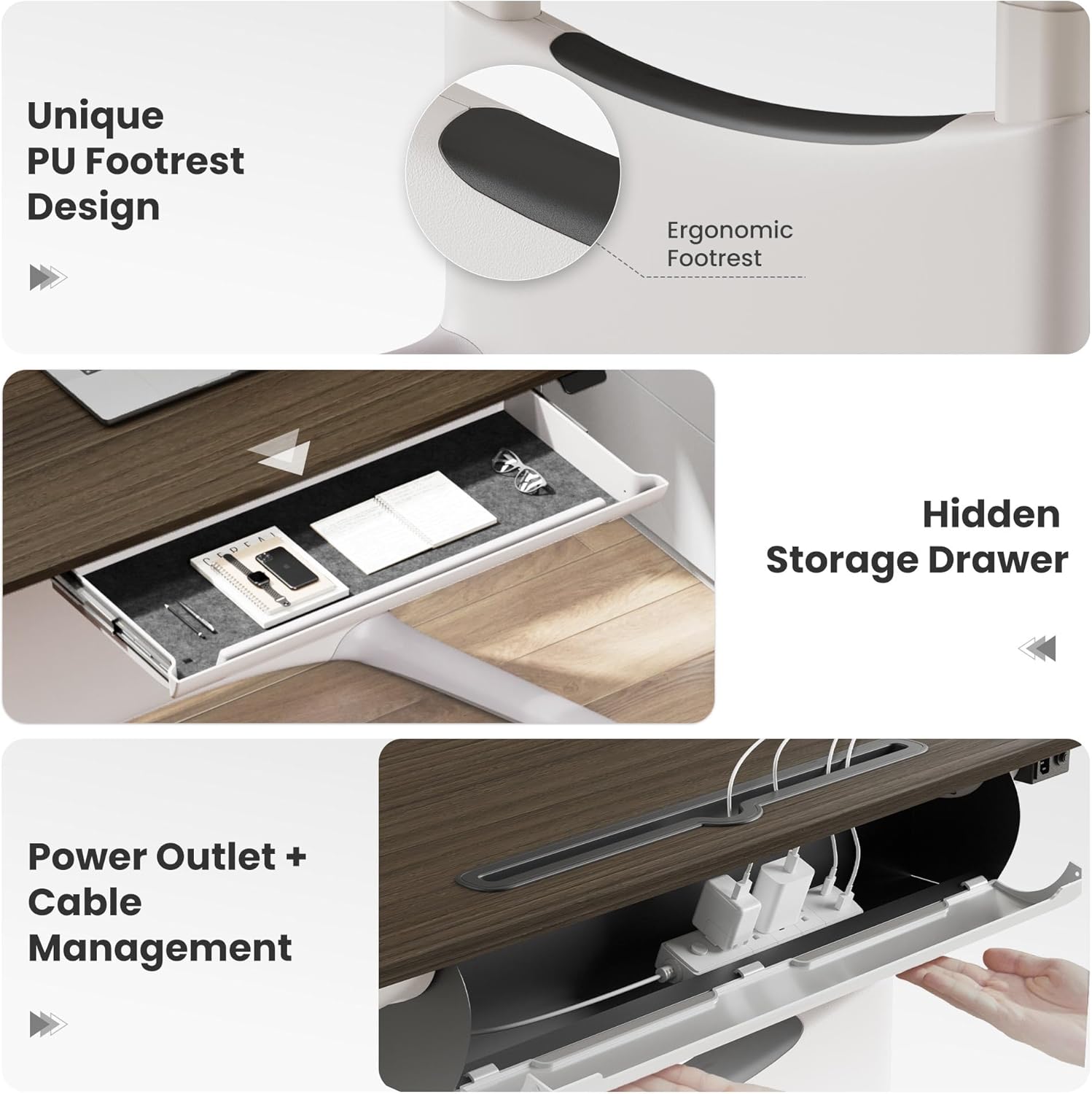 - Hidden Drawer & Organized Workspace: Unlike most standing desks, this one includes a large built-in drawer (25" wide) for easy storage of laptops, notebooks, and accessories. Combined with a rear cable tray + desktop grommet, it keeps your workstation clean, organized, and distraction-free.