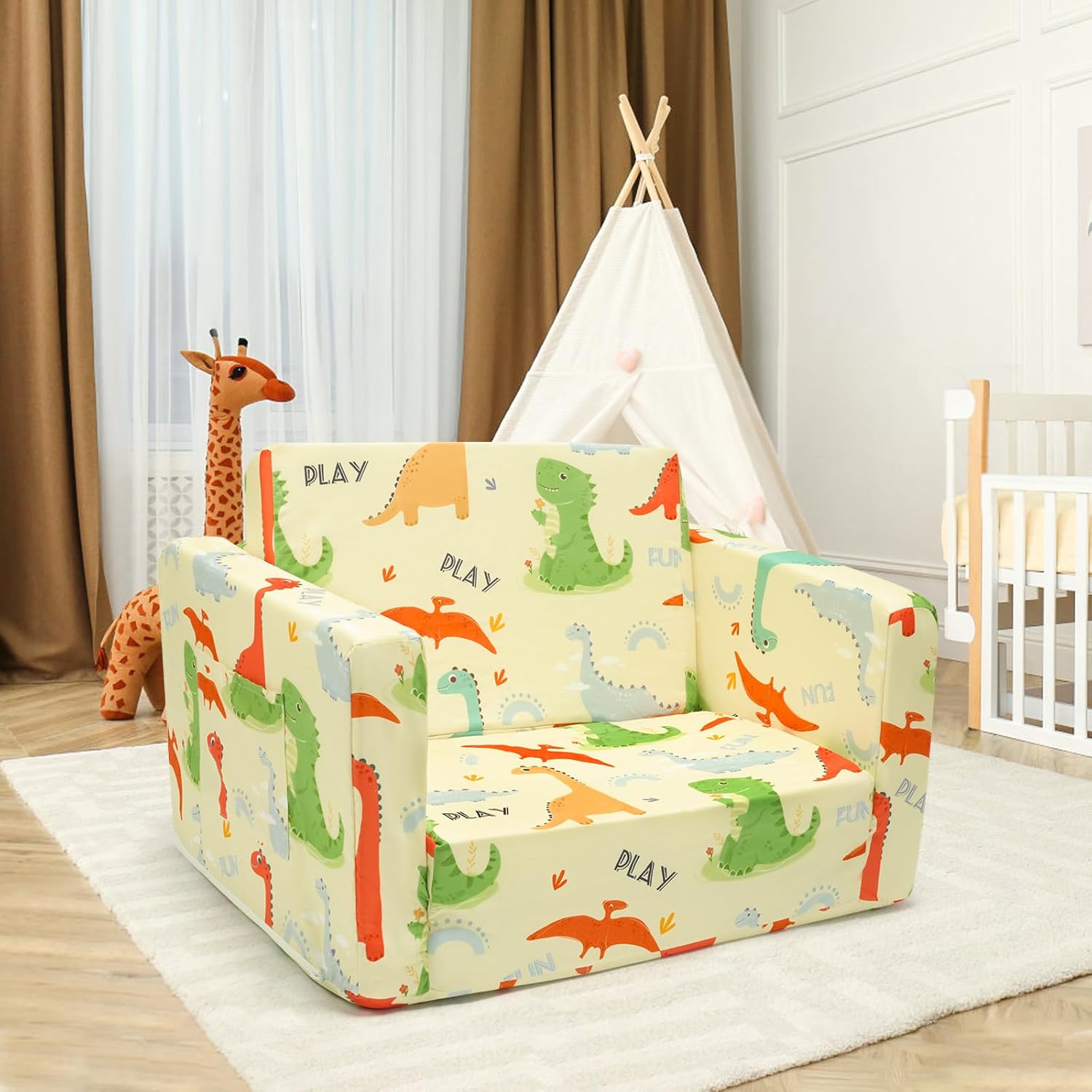 - Custom Dinosaur Theme + Multi-Scene Foldable Bed: Spark imagination with exclusive bear patterns! Converts from a play chair to a travel bed for sleepovers, camping, or daycare naps. Soft grey color hides dirt and matches any room – ideal for playrooms, nurseries, or small apartments
