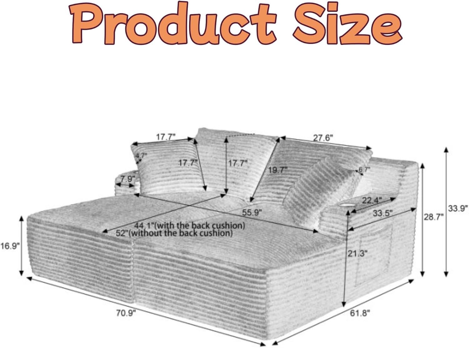 - Spacious and Smart: This double chaise lounge has a width of 70.9", providing ample leisure space for two people. The side pockets on both sides of the oversized chaise allow for easy access to remote controls and magazines. The built-in cup holders securely hold beverages, and the wide armrests provide a comfortable place for your arms.