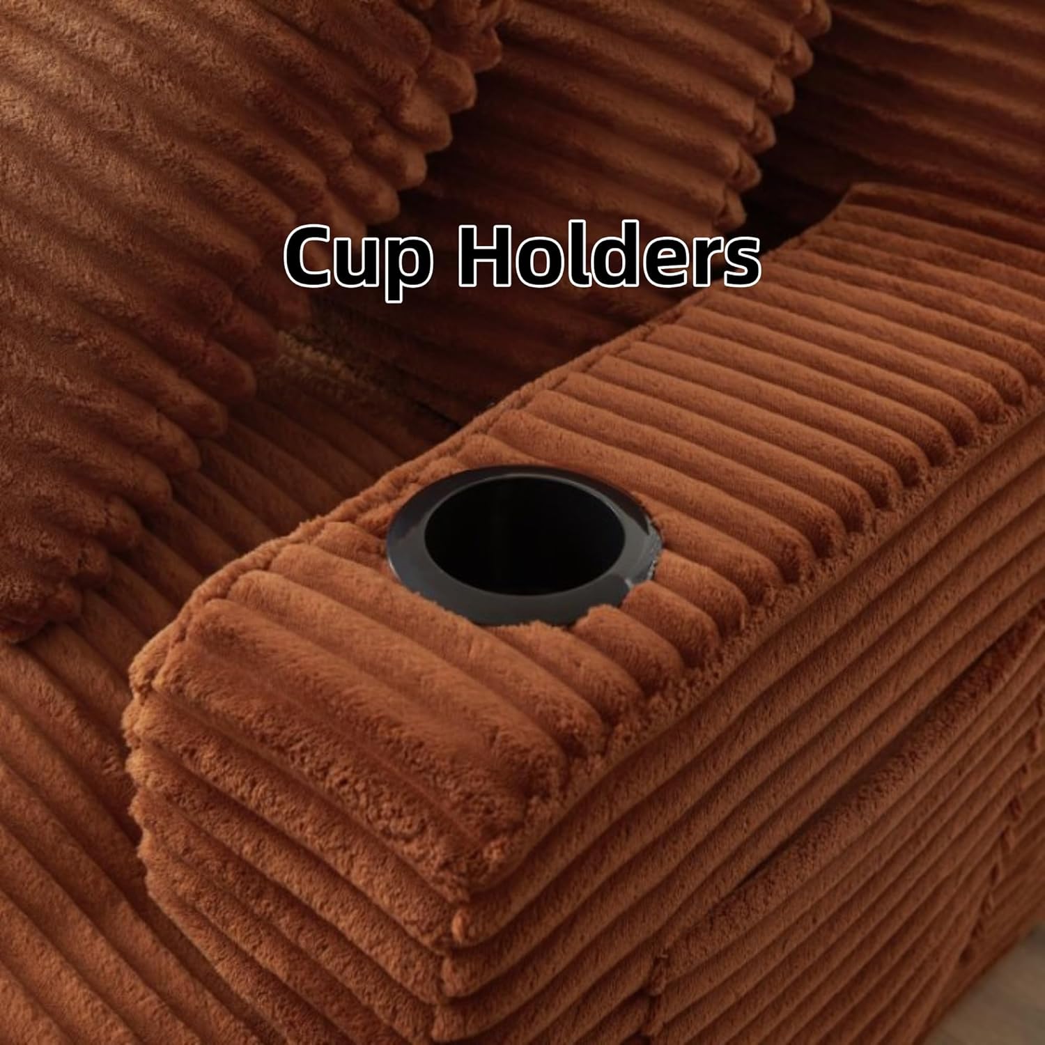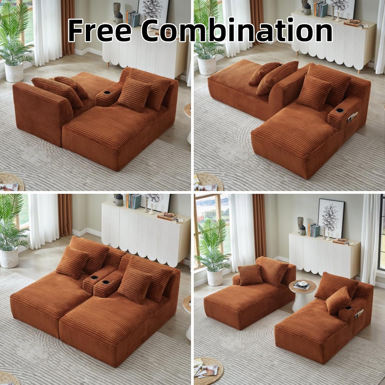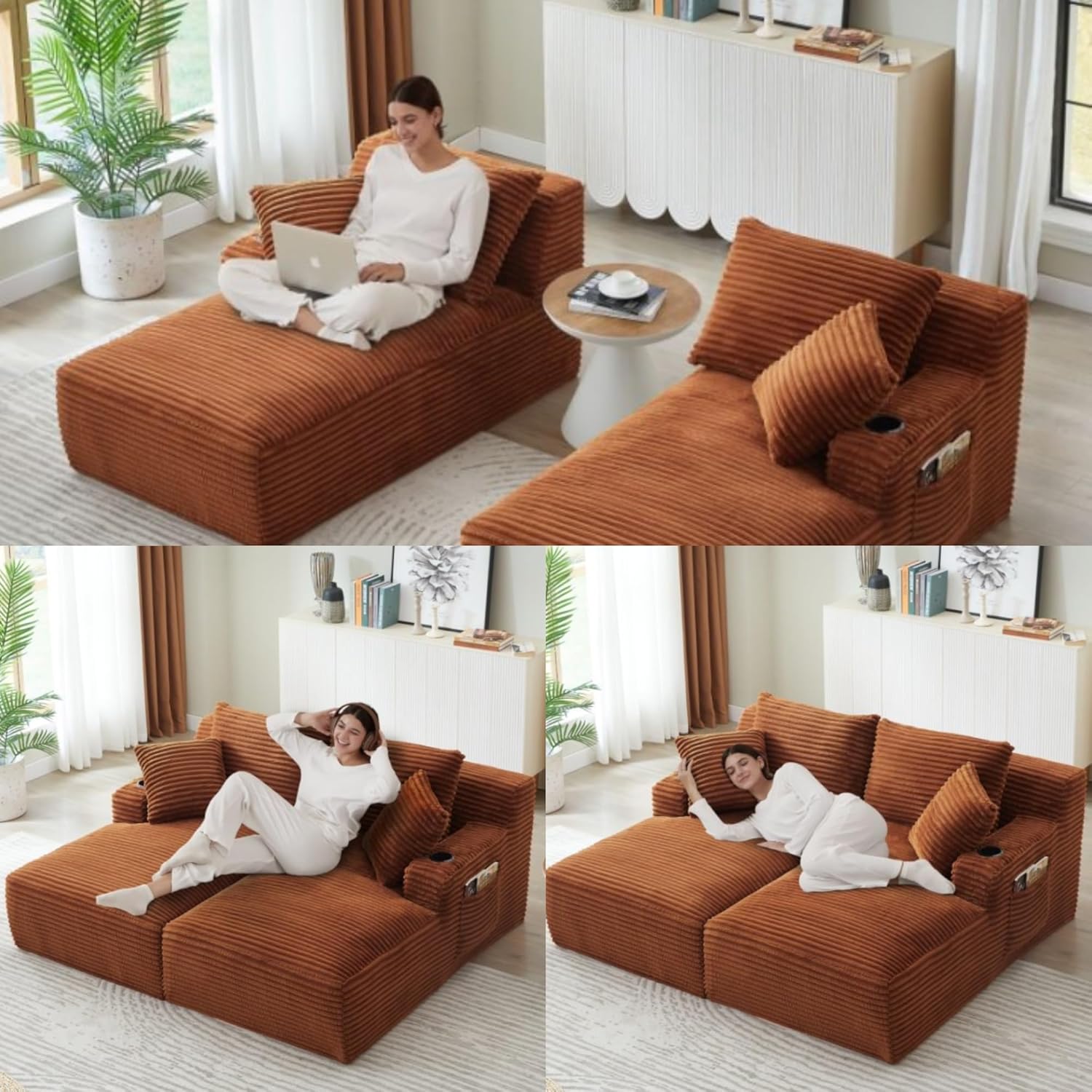 Oversized Sectional Double Chaise Lounge, Compressed Boneless Lounge Chaise with Cupholders, Boneless Sofa with Deep Seat, Fluffy Modern Sleeper Loveseat for Indoor Living Room, Orange