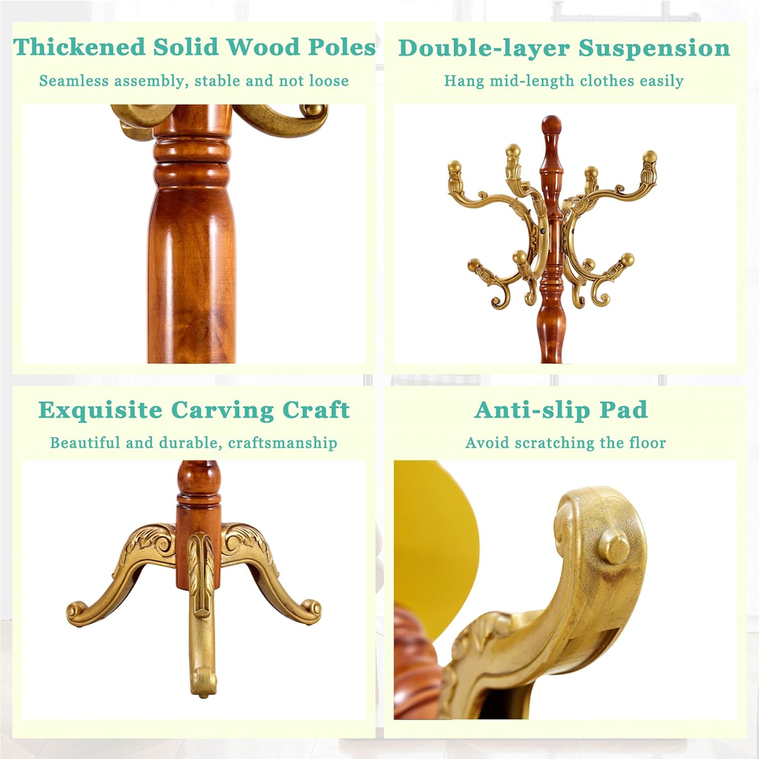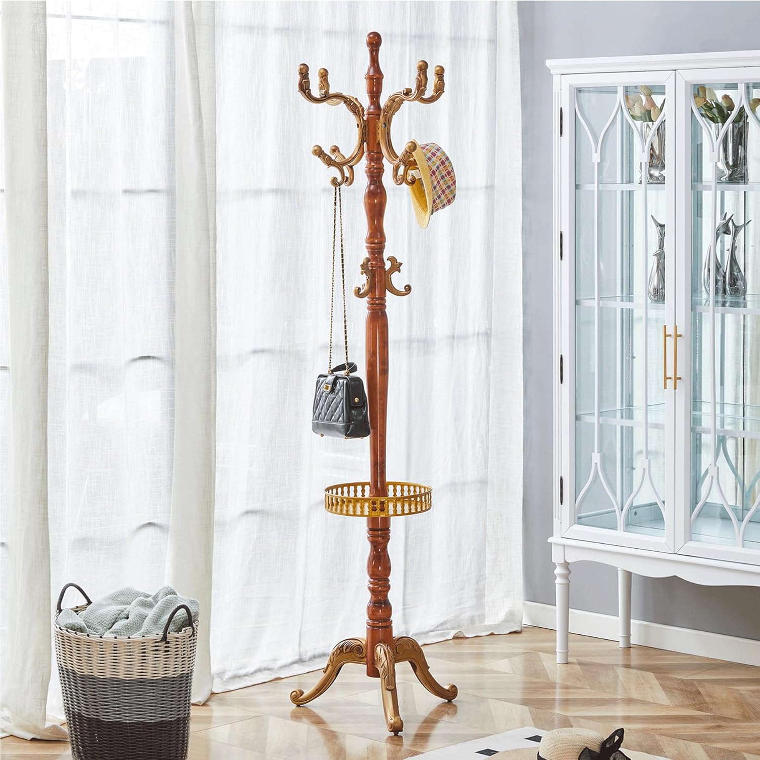 Solid Wood Coat Rack Freestanding, 77" Adjustable Hall Tree Hanger With Hooks, Coat Hanger Stand for Hanging Clothes Bags Hats in Living Room Bedroom