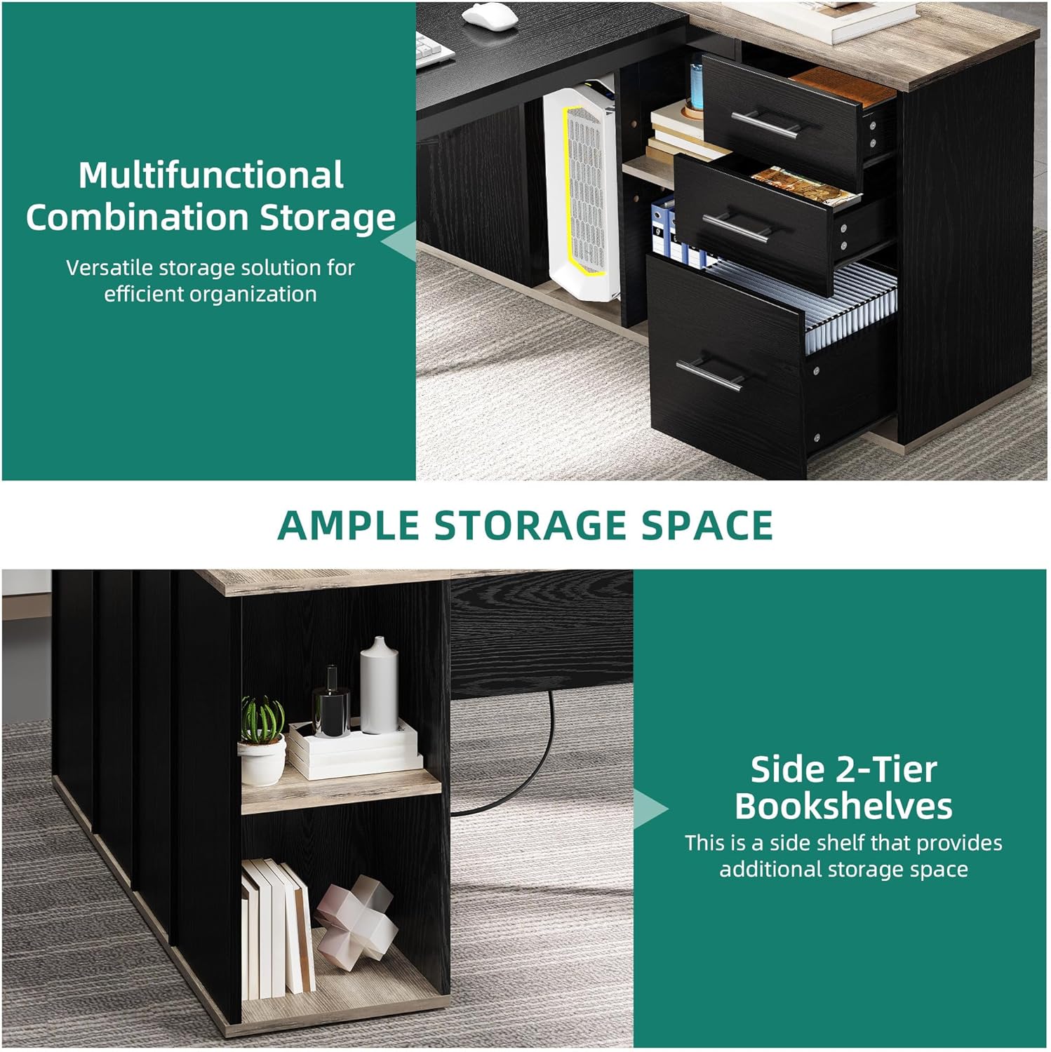 - Ample Storage Space: Combines a executive desk with a file cabinet featuring 1 file drawer for letter, A4 size documents, 2 drawers for small office supplies, 1 CPU stand for storing host from scratching, 2 open shelves and side 2-tier bookshelves for more office essential within easy reach or display decorative items, the l shaped desk with drawers can meet different storage need