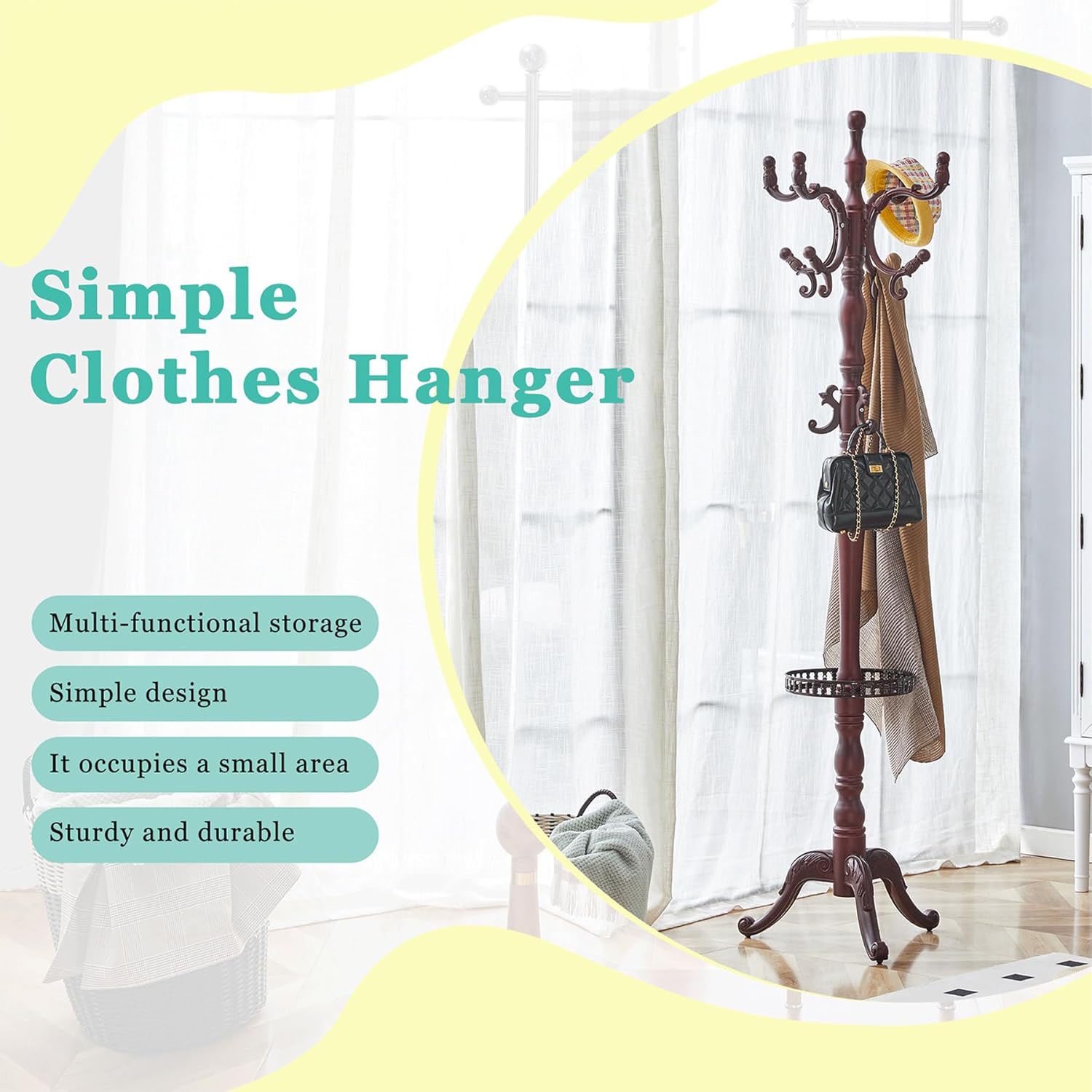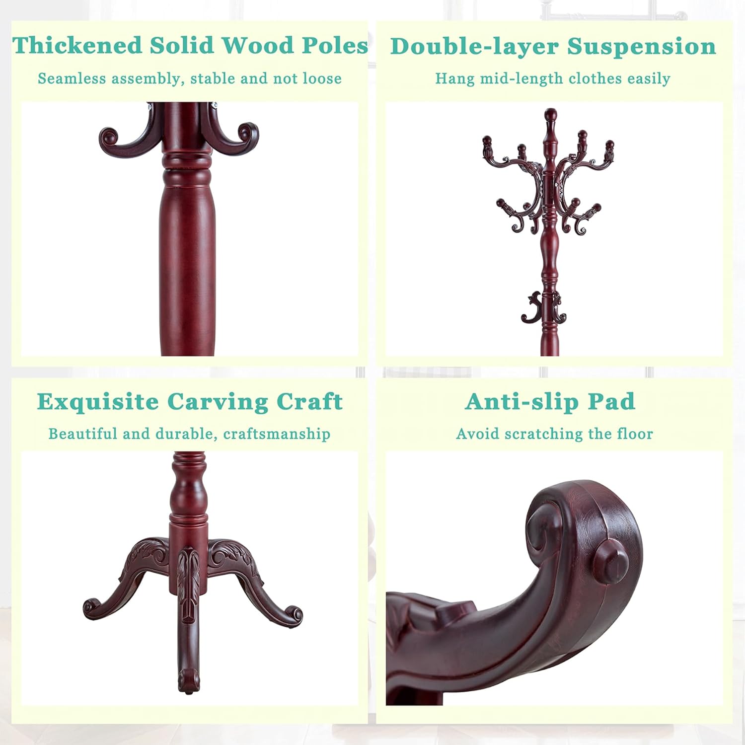 - High end material combination: The main body is made of walnut solid wood material, with natural and elegant texture, matched with resin hooks and feet, stable, durable and lightweight; The disc and bottom support frame are made of stainless steel spray painted technology, which is rust resistant and wear-resistant, highlighting the quality of life.