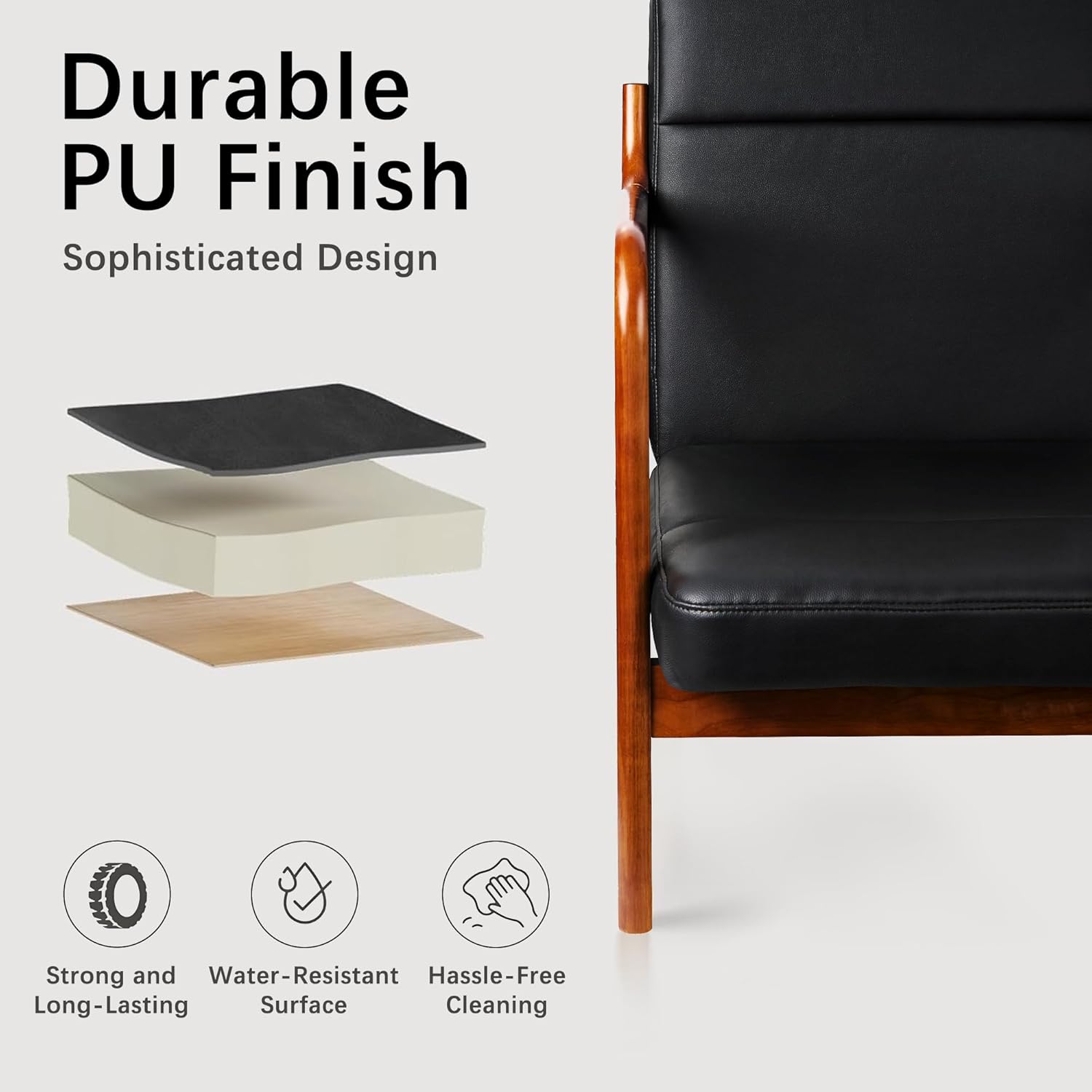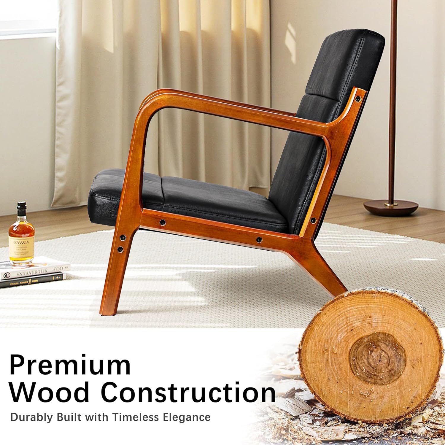 VECELO Mid-Century Modern Accent Chair with Faux Leather Cushion & Solid Wood Frame, Lounge Armchair for Living Room, Bedroom, Office, Black
