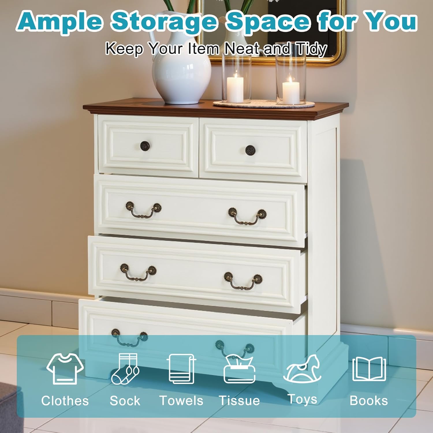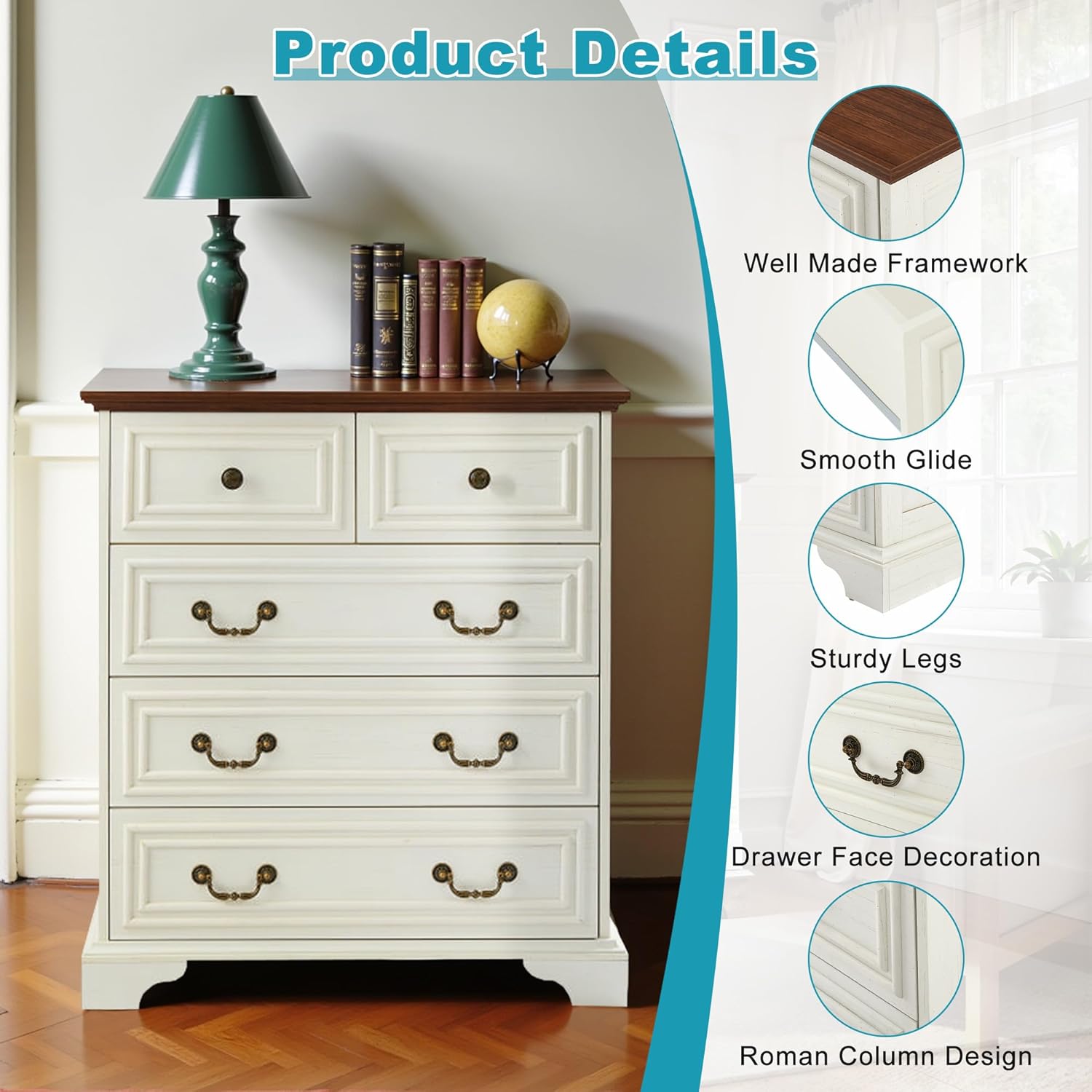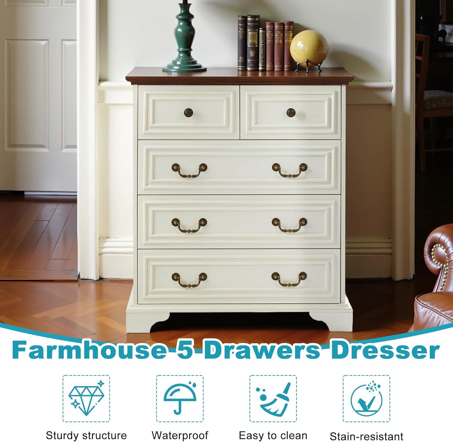 31.5" Farmhouse Sideboard Buffet Cabinet with Storage, Kitchen Buffet Storage Cabinet with 5 Drawers, Modern Wood Accent Sideboard for Living Room, Kitchen, Hallway(Antique Brown+White)