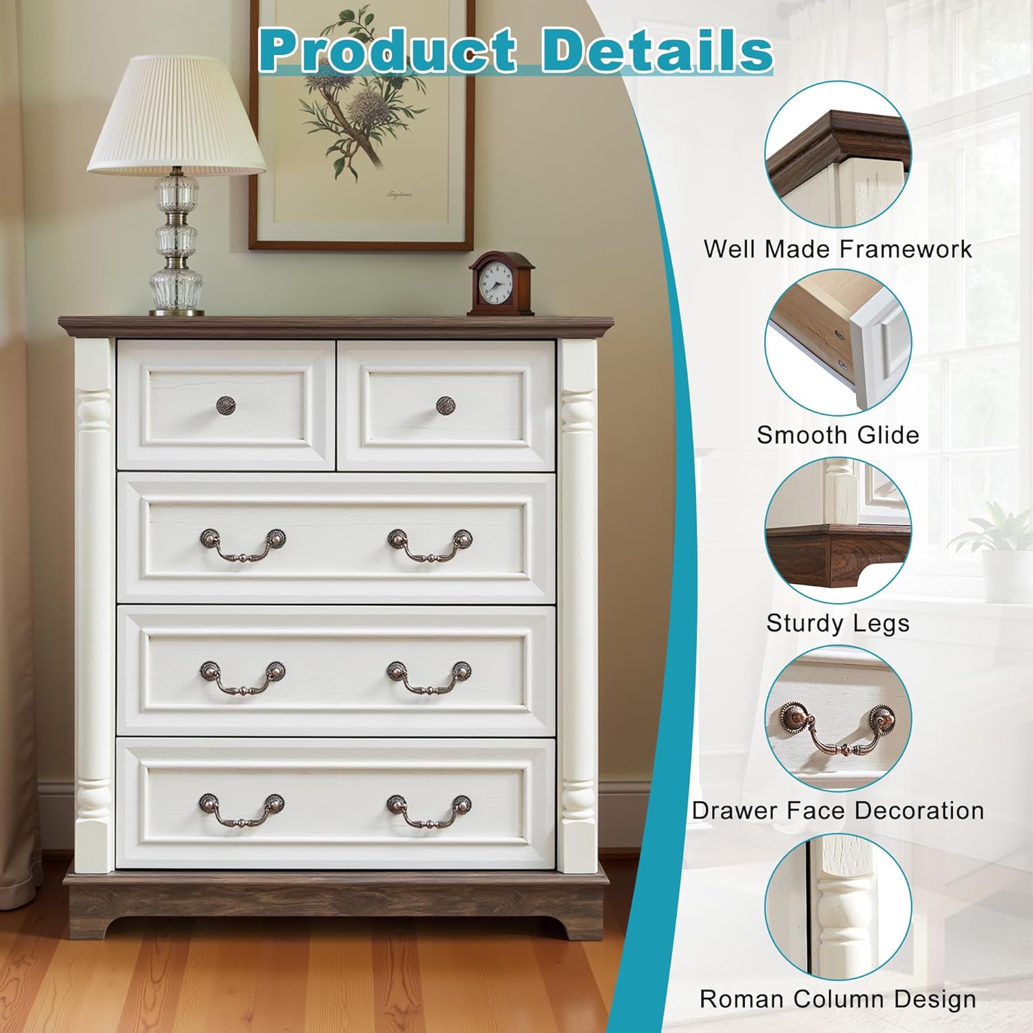 31.5" Farmhouse Sideboard Buffet Cabinet with Storage, Kitchen Buffet Storage Cabinet with 5 Drawers, Modern Wood Accent Sideboard for Living Room, Kitchen, Hallway(Antique White)