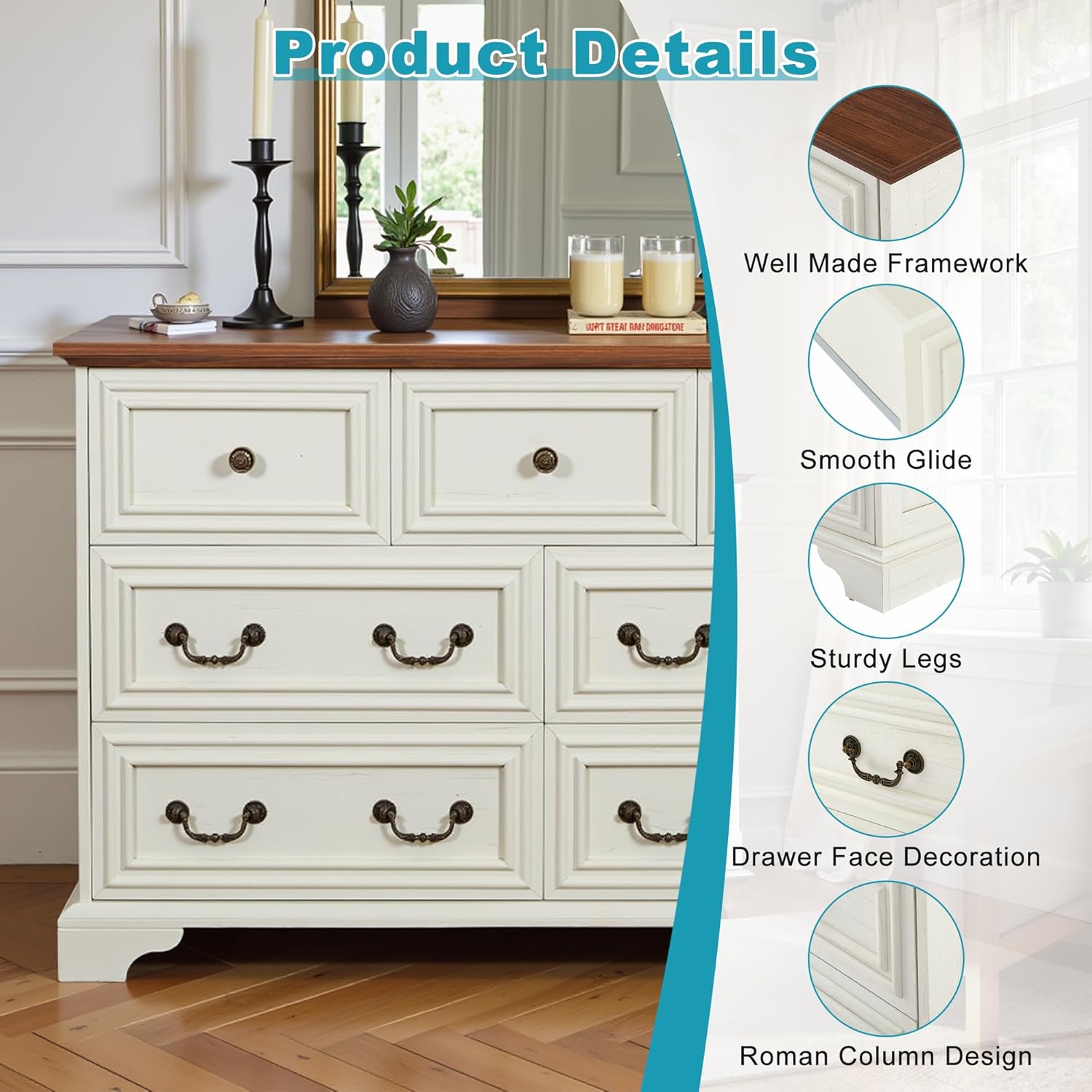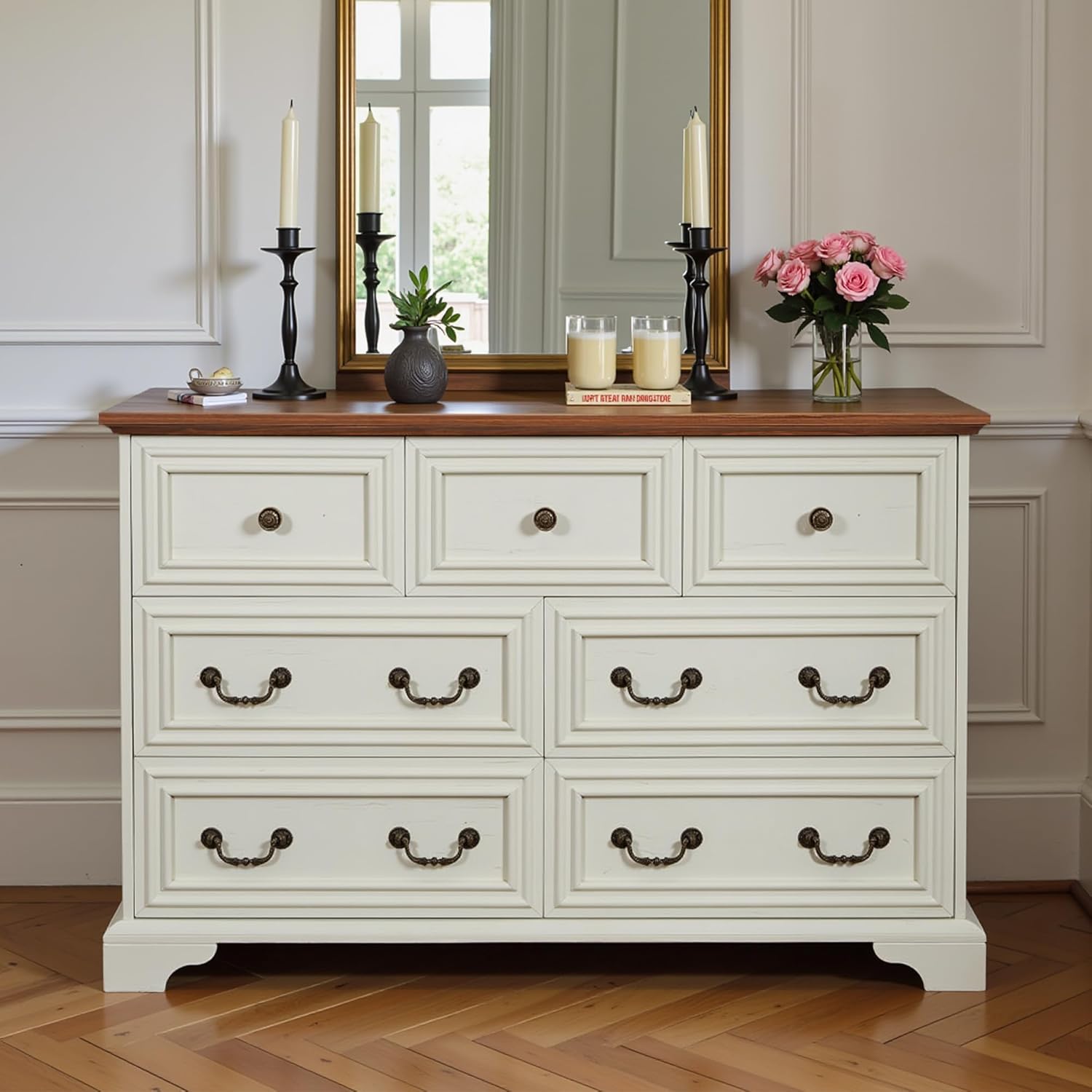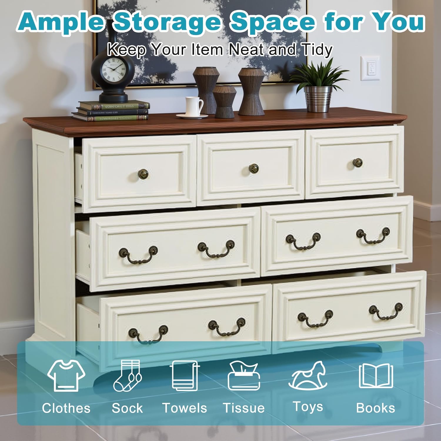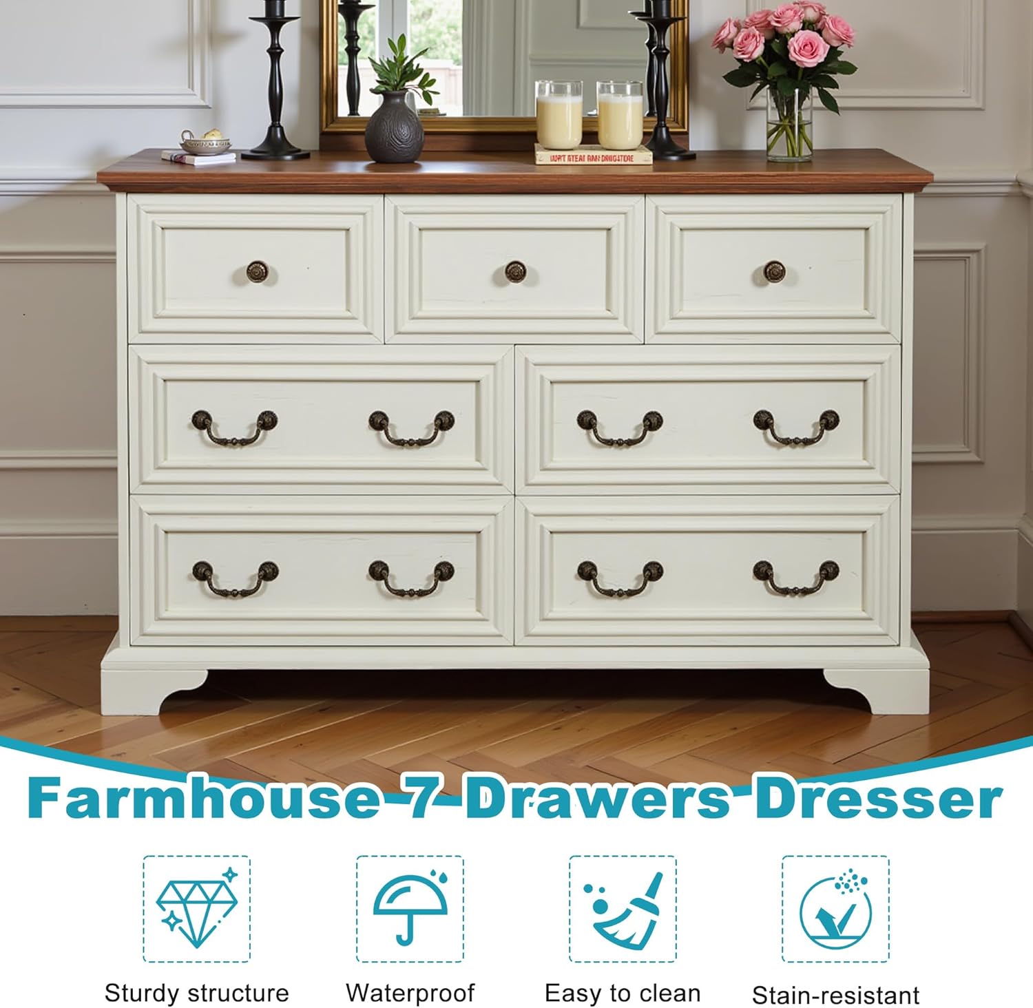 47.2" Farmhouse Sideboard Buffet Cabinet with Storage, Kitchen Buffet Storage Cabinet with 7 Drawers, Modern Wood Accent Sideboard for Living Room, Kitchen, Hallway(Antique Brown+White)