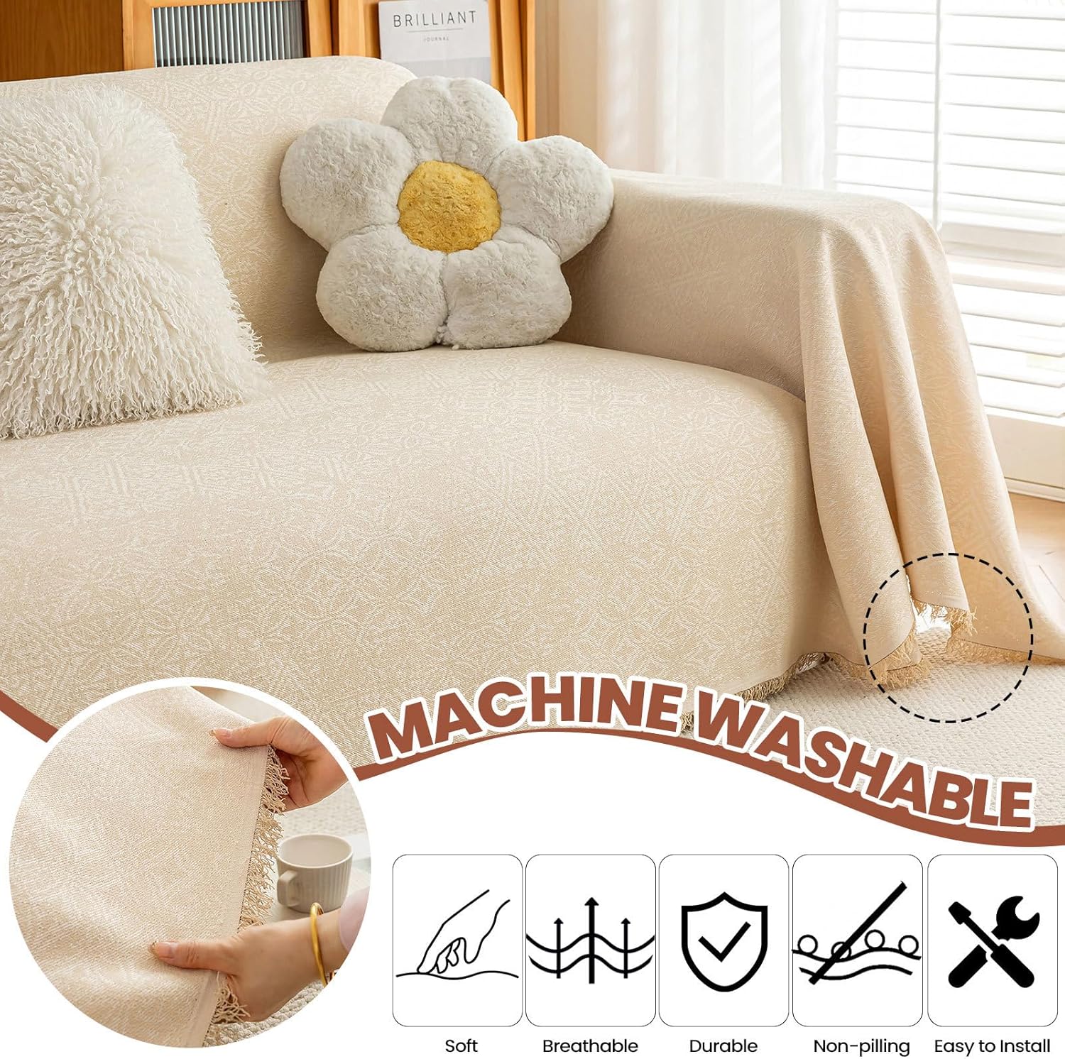 STACYPIK Thick Beige Jacquard Floral Couch Cover for Dogs, Washable Boho Couch Covers, Non Slip Couch Sofa Cover, Couch Cover 3 Cushion Sofa with Tassels, Furniture Protector for Living Room-71X134IN