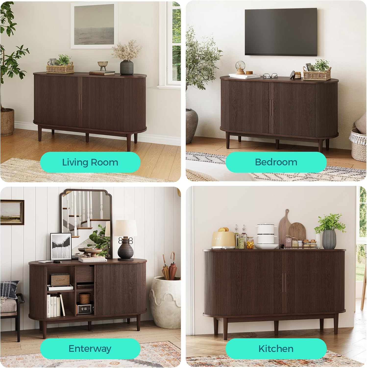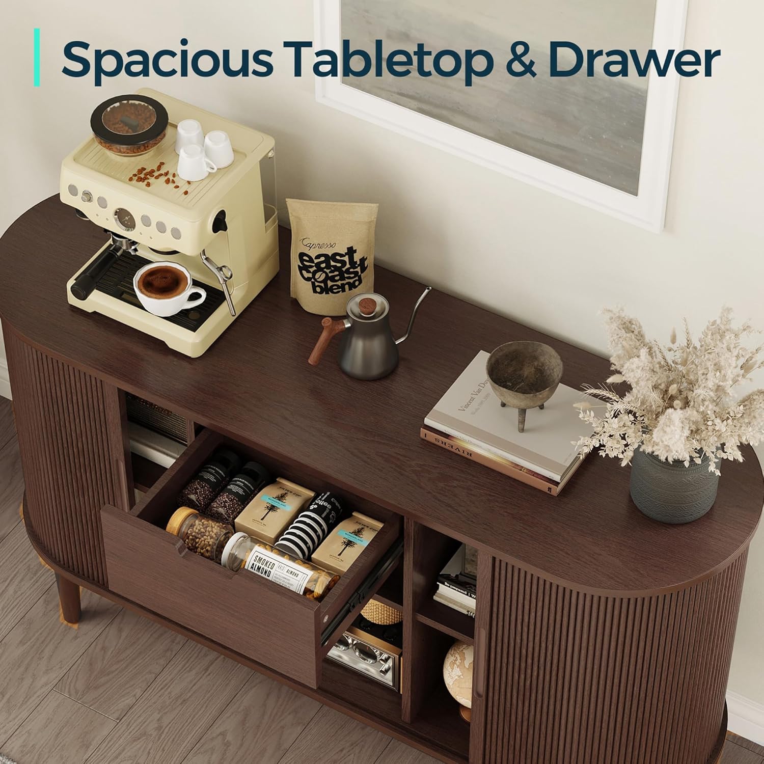 LINSY HOME Sideboard Buffet Cabinet with Storage, 55" Fluted Coffee Bar Cabinet with Tambour Sliding Doors and Drawer, Mid Century Modern Wood Storage Buffet Table for Kitchen, Vintage Walnut