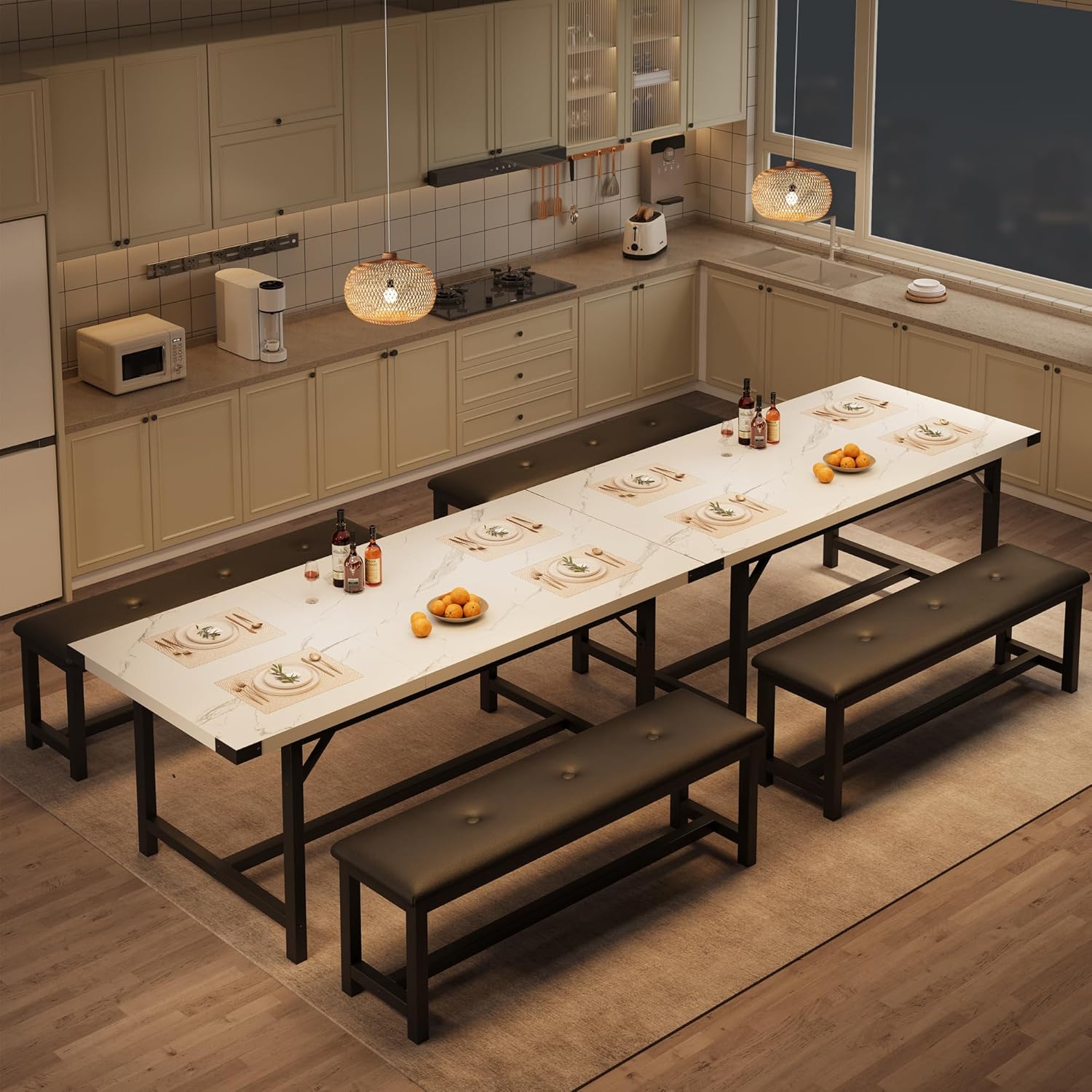 3-Piece Dining Table Set for 4-6 People, Extendable Kitchen Table Set with 2 Upholstered Benches, Dining Room Table Set for Apartment, Kitchen, Living Room, Marble White