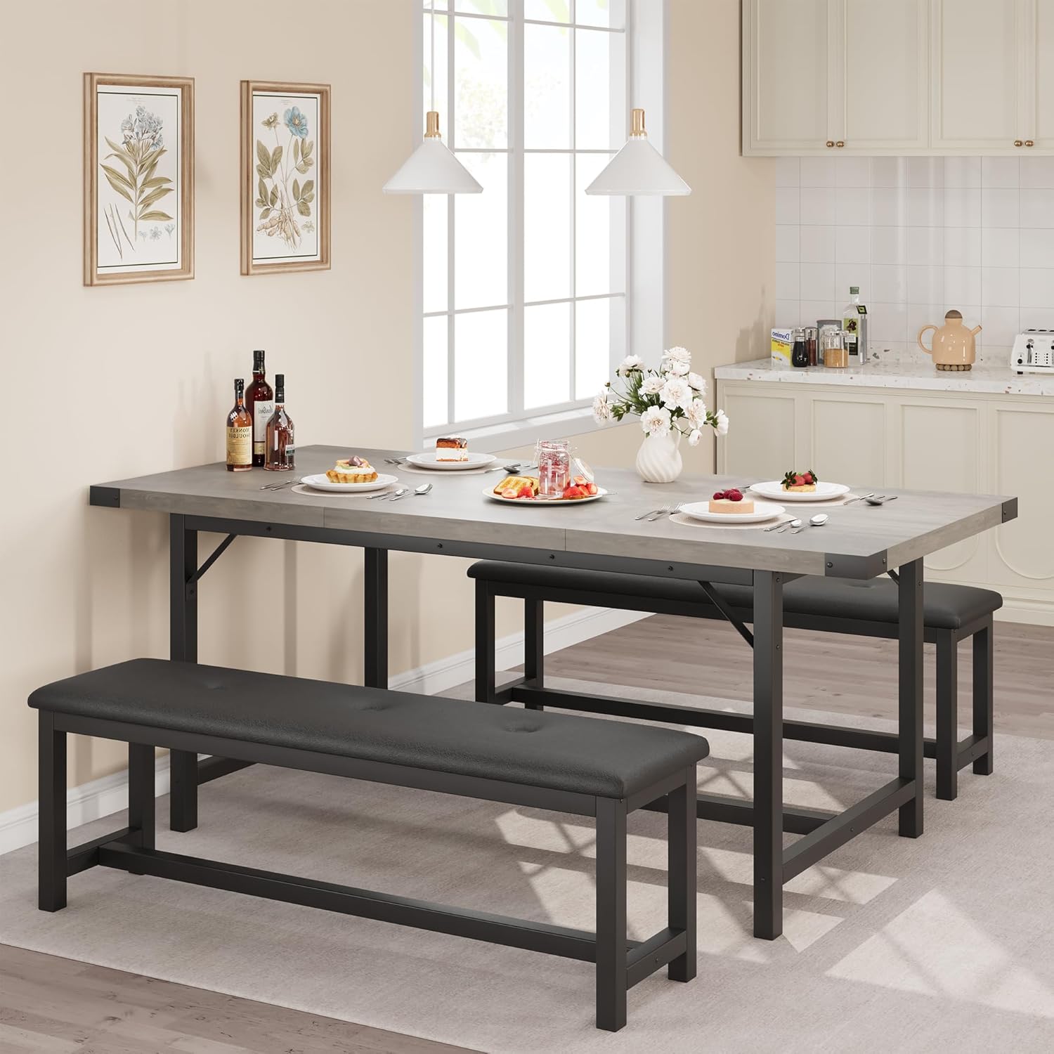 3-Piece Dining Table Set for 4-6 People, Extendable Kitchen Table Set with 2 Upholstered Benches, Dining Room Table Set for Apartment, Kitchen, Living Room, Gray