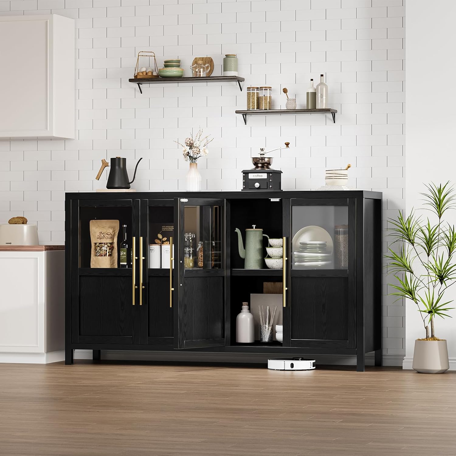 - Elegant Showcase: The glass door sideboard buffet cabinet showcases dinnerware and decor, adding elegance and openness to any room, while the wooden parts provide privacy for less frequently used items, keeping your space organized and tidy.