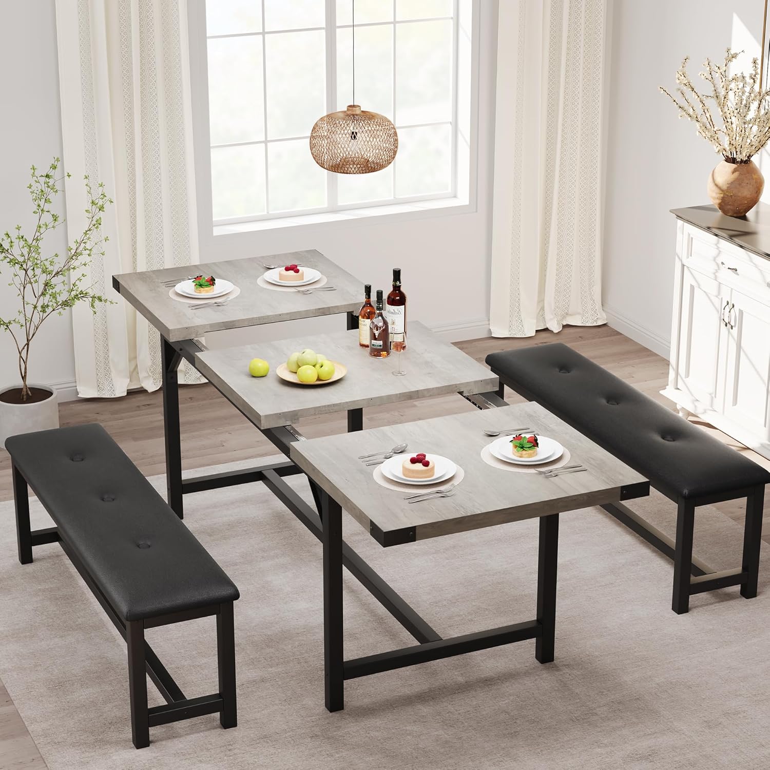 GarveeHome Dining Table Set for 4-6, 63" Extendable Wood Dining Room Table with Corner Protector & 2 Upholstered Benches, Kitchen Table Set for Apartment, Small Space, Easy Assembly,Retro Gray