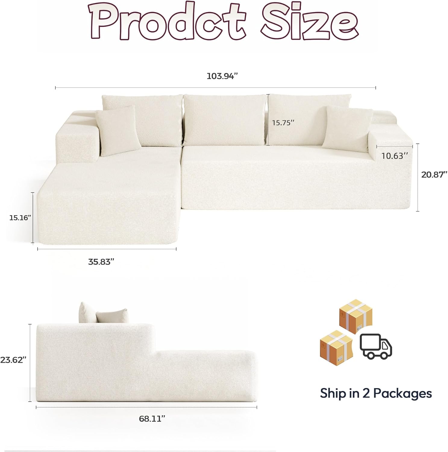 - Spacious and Practical: The L-shaped luxury combination oversized sofa measures 103.94" x 68.11" x 23.62" and has a seat depth of 25.3". Relax in a spacious space that adapts to various space needs.