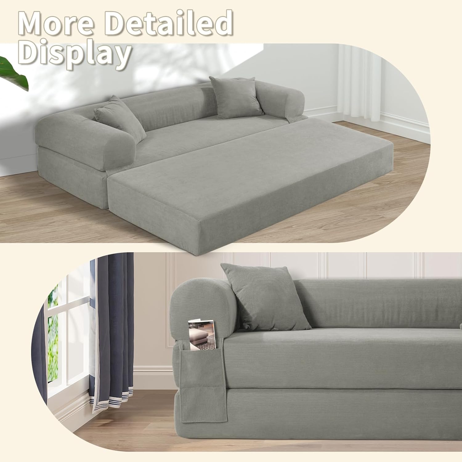80" Convertible Sofa Bed, Corduroy Deep Seat Folding Pull Out Couch with Pillows, No Assembly Modern Boneless Couch Compression Sofa in Box, Floor Sofa with Storage Pocket for Living Room,Light grey