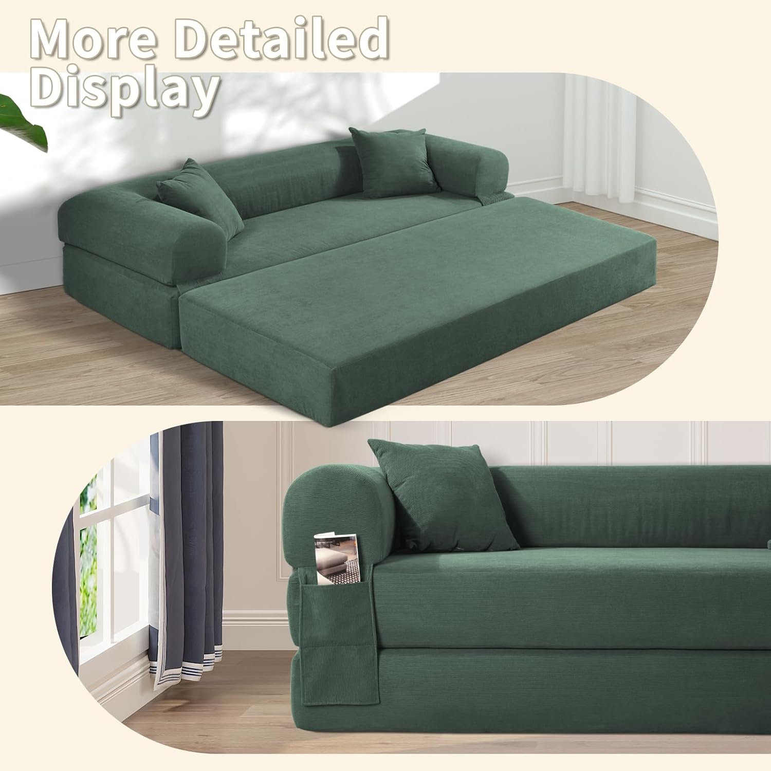 80" Convertible Sofa Bed, Corduroy Deep Seat Folding Pull Out Couch with Pillows, No Assembly Modern Boneless Couch Compression Sofa in Box, Floor Sofa with Storage Pocket for Living Room,Light Green