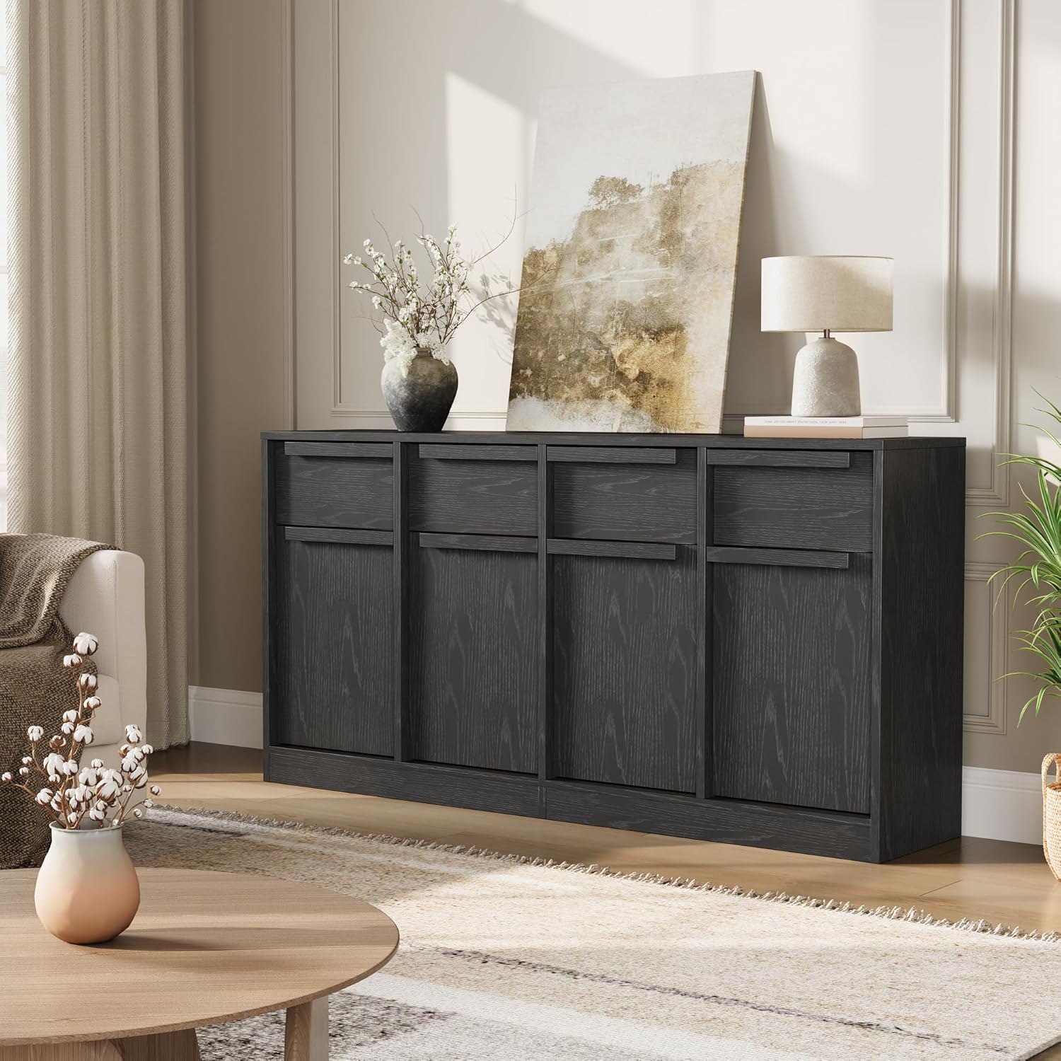 GarveeHome Sideboard Buffet Cabinet with 4 Drawers, 62.4" Large Coffee Cabinet with Storage, Modern Storage Buffet Table for Kitchen Dining Room, Living Room (Black, 4 Doors & 4 Drawers)
