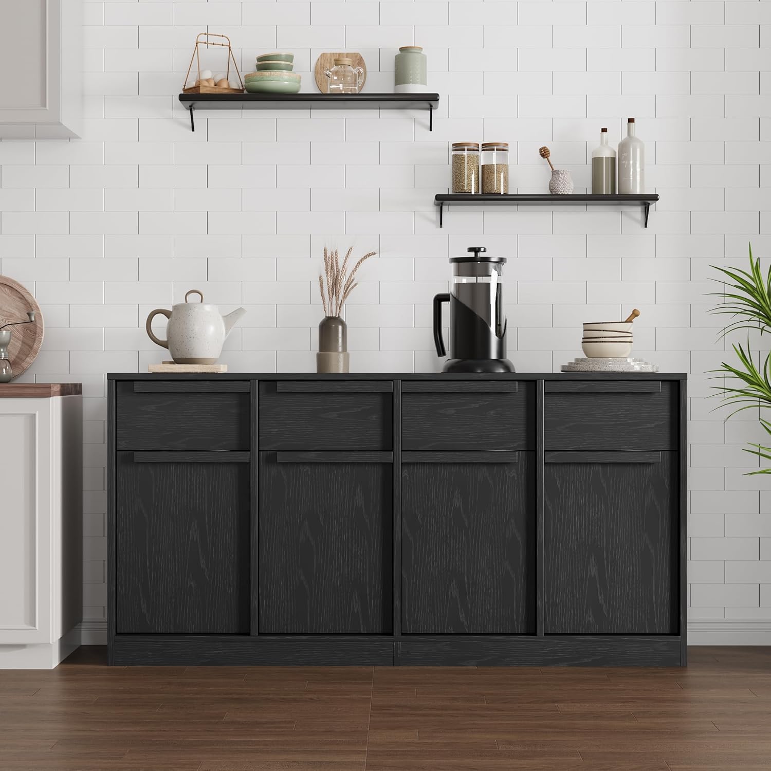 - Elegant Showcase: The sideboard buffet cabinet with 4 drawers showcases dinnerware and decor, adding elegance and openness to any room, while the wooden parts provide privacy for less frequently used items, keeping your space organized and tidy.
