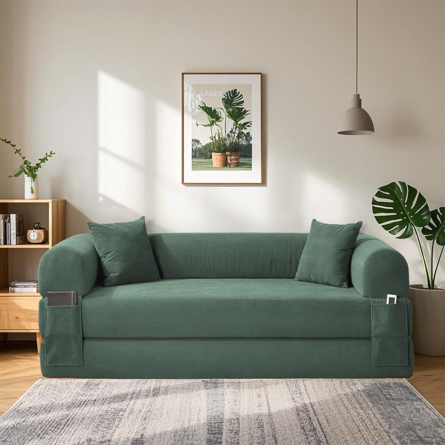 80" Convertible Sofa Bed, 3-in-1 Corduroy Folding Pull Out Couch with Pillows, No Assembly Modern Boneless Couch Compression Sofa in Box, Floor Sofa with Side Storage for Living Room,Light Green