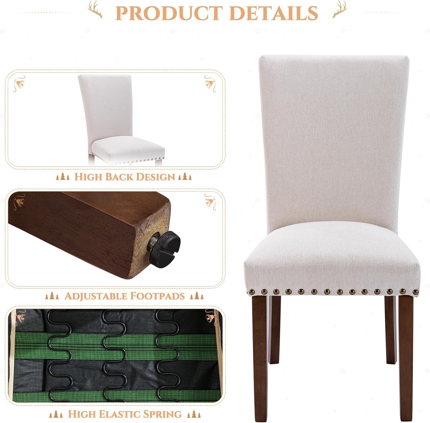 Set of 4 Beige Upholstered Dining Chairs, Farmhouse Kitchen Chairs with High Back Support, Solid Rubberwood Legs, Comfortable Padded Seat, Bronze Nailhead Trim, Dining Room Chairs for Family Meals