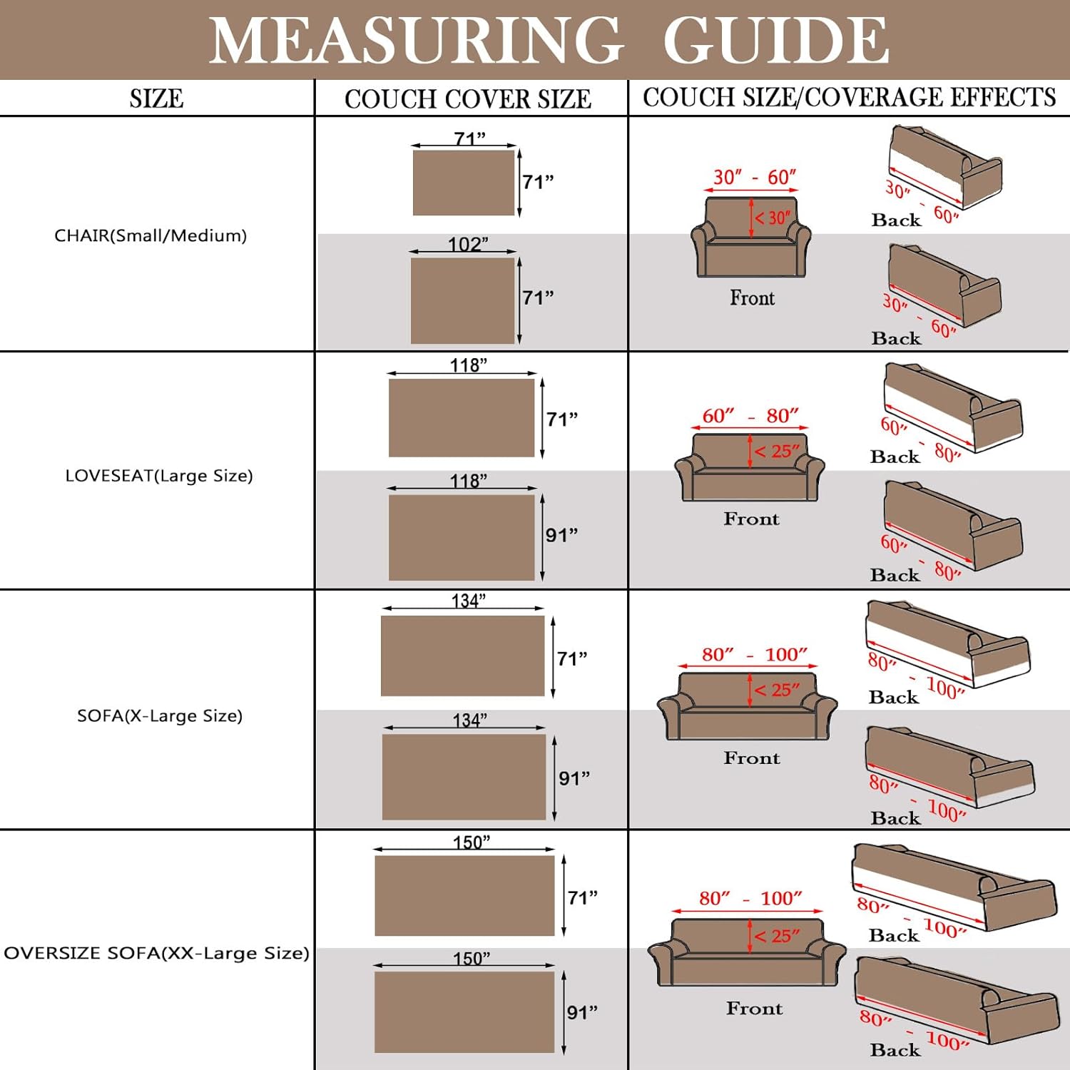 - EASY INSTALLATION: With our user-friendly design, you can cover your entire sofa in just 10 seconds. Simply refer to the installation guide to measure your sofa and select the perfect size. We recommend Medium size 71" x 102 " for armchair; Large Size 71" x 118 " for loveseat; X-Large Size 71" x 134" for sofas; XX-Large Size 71" x 150" for oversize sofas; Suitable for most couch, Provide perfect coverage for the sofa (including armrests)