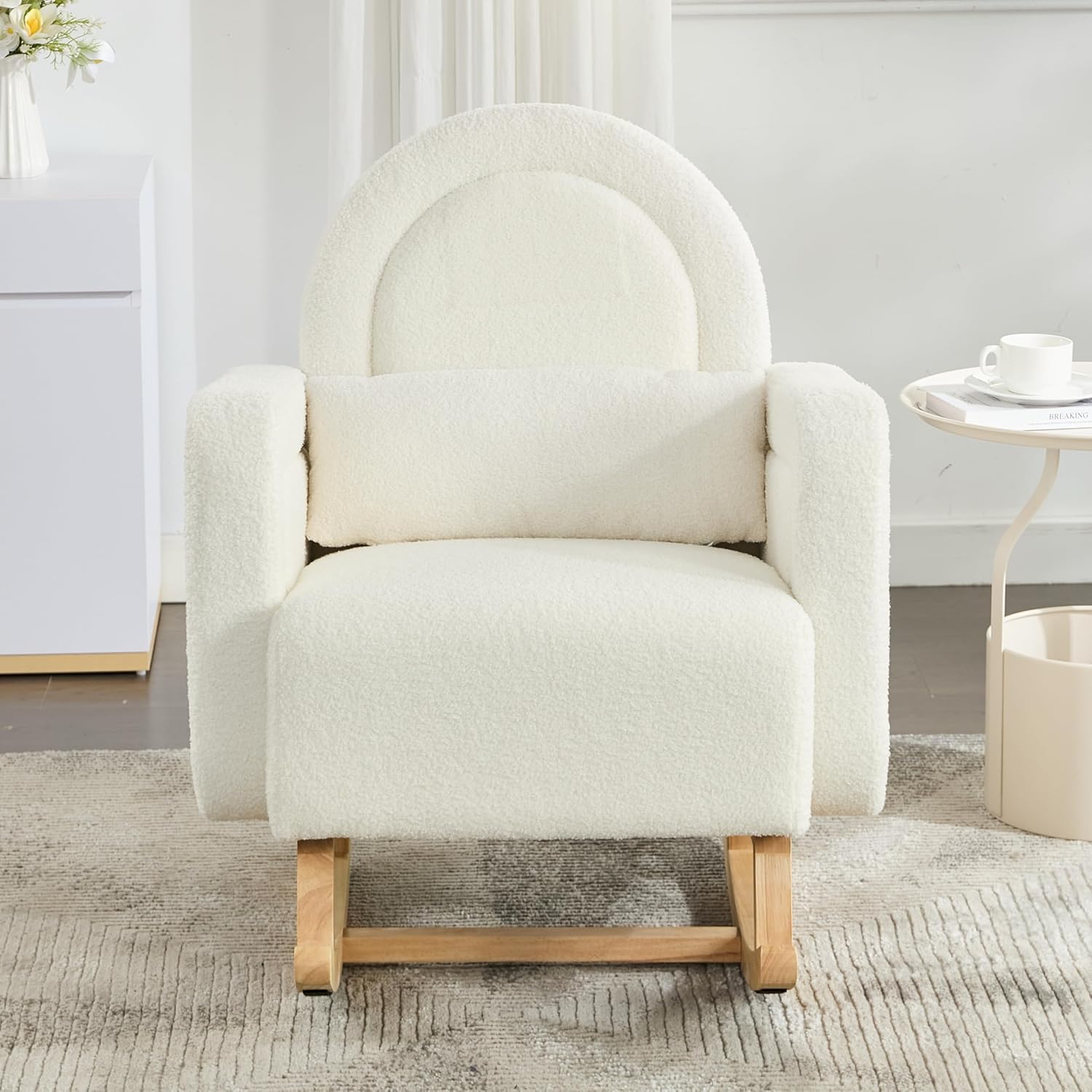 Christopher Knight Home Kiin Wooden Rocking Chair Indoor with Curved Back, Teddy Upholstered Rockers with Pillow, Comfy Accent Chair with Armrest for Bedroom, Living Room, Offices, Cream White