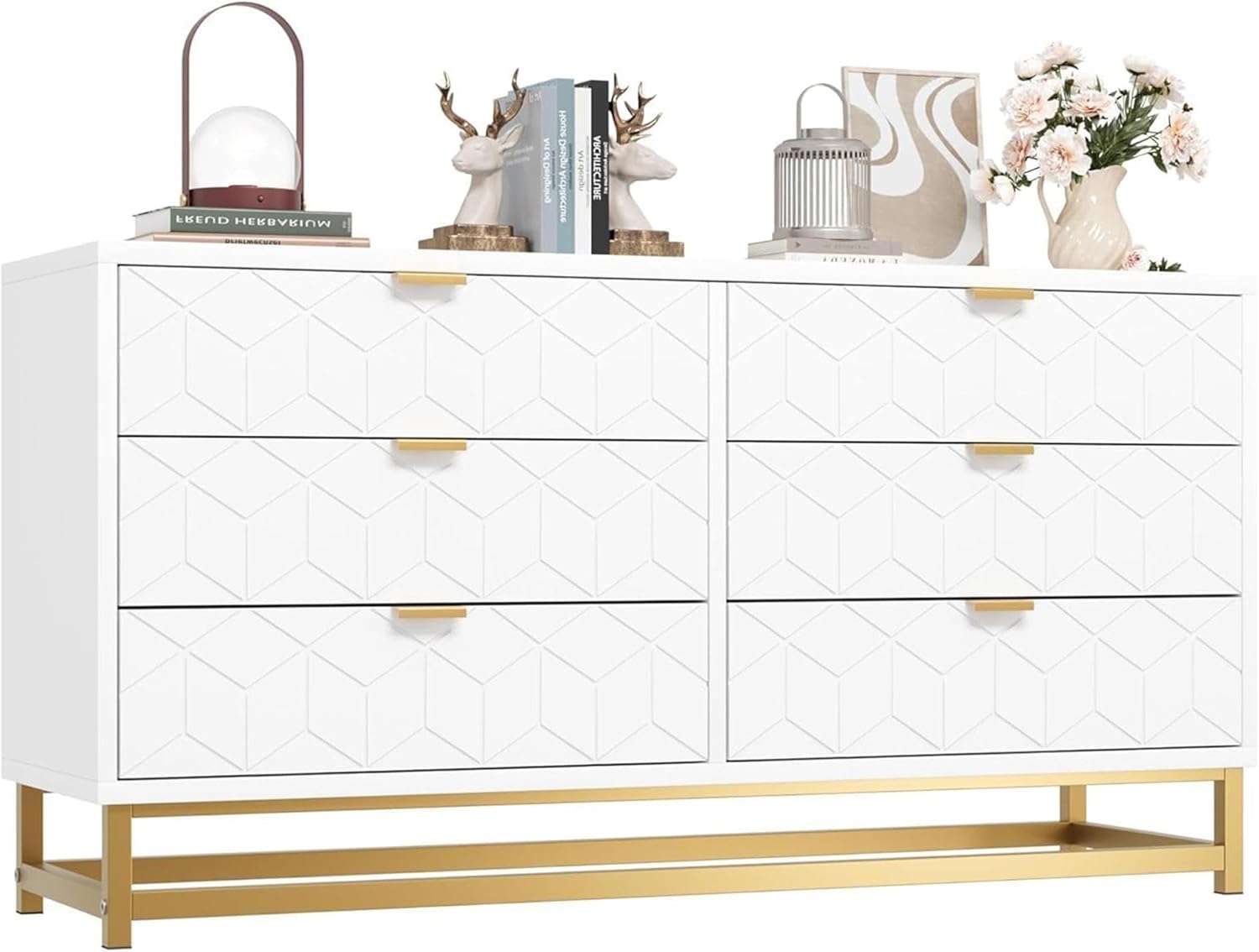Dresser for Bedroom, 53.5" Large Dresser Organizer, 6 Drawer with Golden Metal Handle and Legs, Modern Chest of Drawers, White Dressers with Drawers for Closet, Hallway, Living Room, Entryway