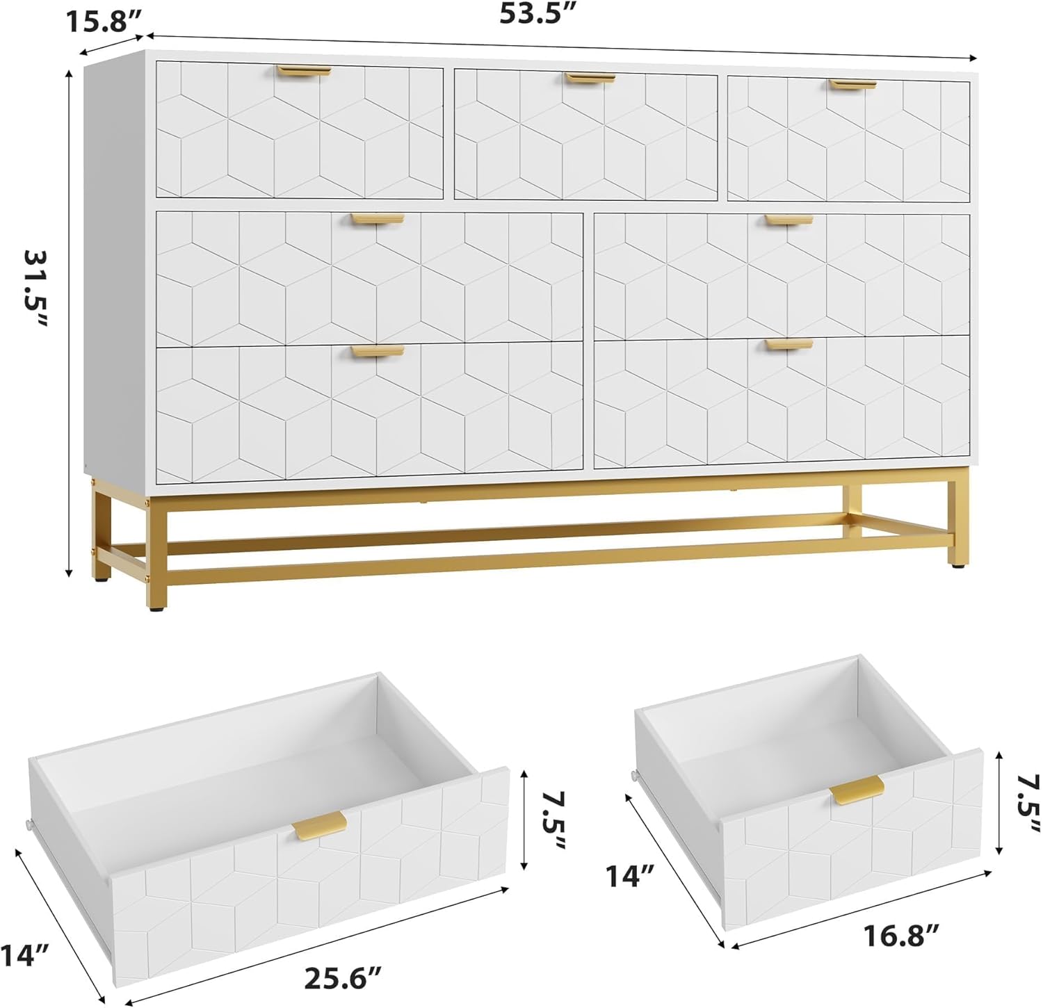 Dresser for Bedroom, 53.5" Wide Dresser Organizer, 7 Drawer with Golden Metal Handle and Legs, Modern Chest of Drawers for Closet, Hallway, Living Room, Entryway, White
