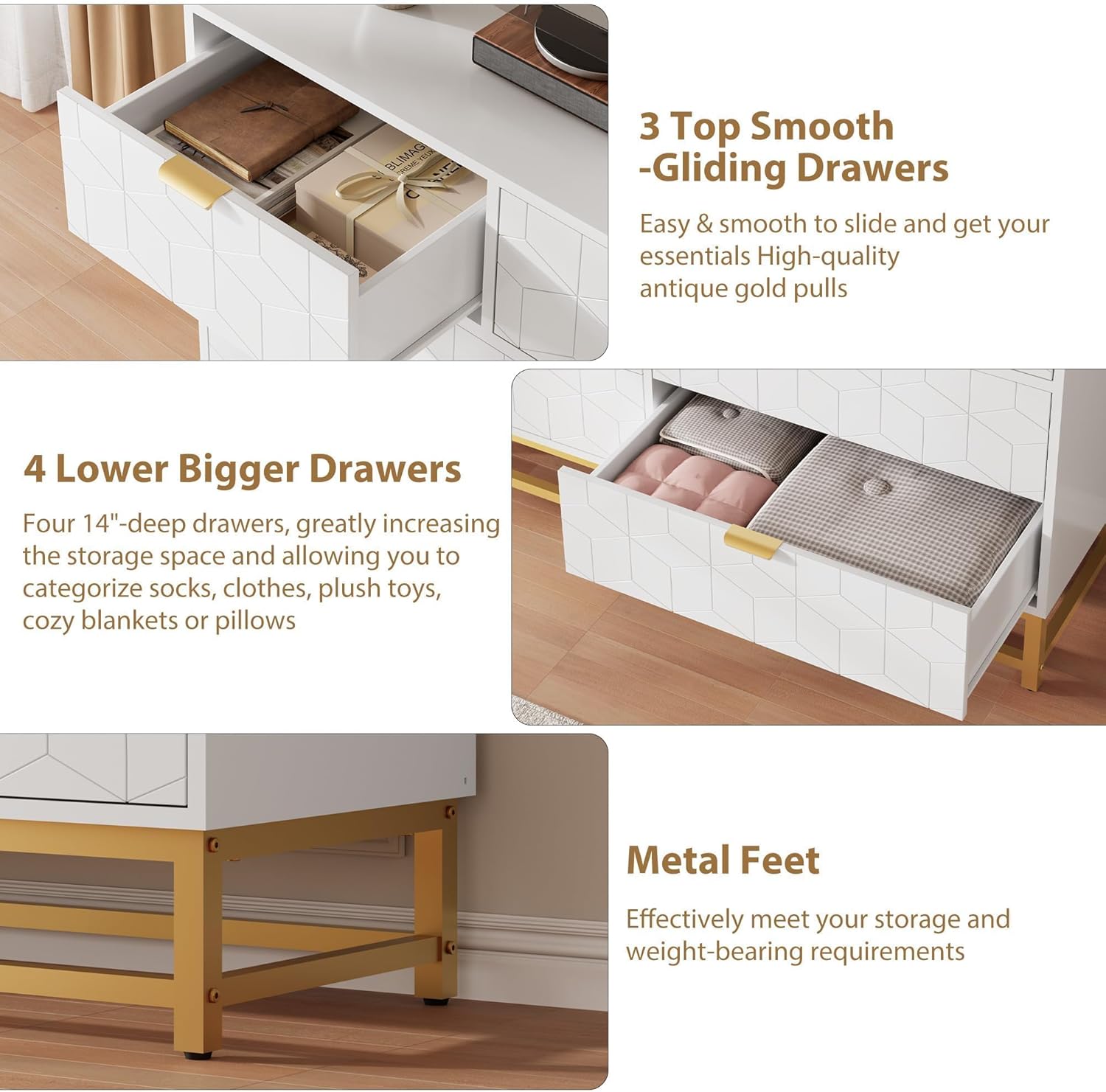 - Elegant and stylish style - Featuring a unique groove design, golden base, and handles, this dressers for bedroom exudes an elegant and stylish ambiance. This dresser serves as the perfect bedroom decoration, effortlessly complementing different styles and enhancing the space with a touch of charm.