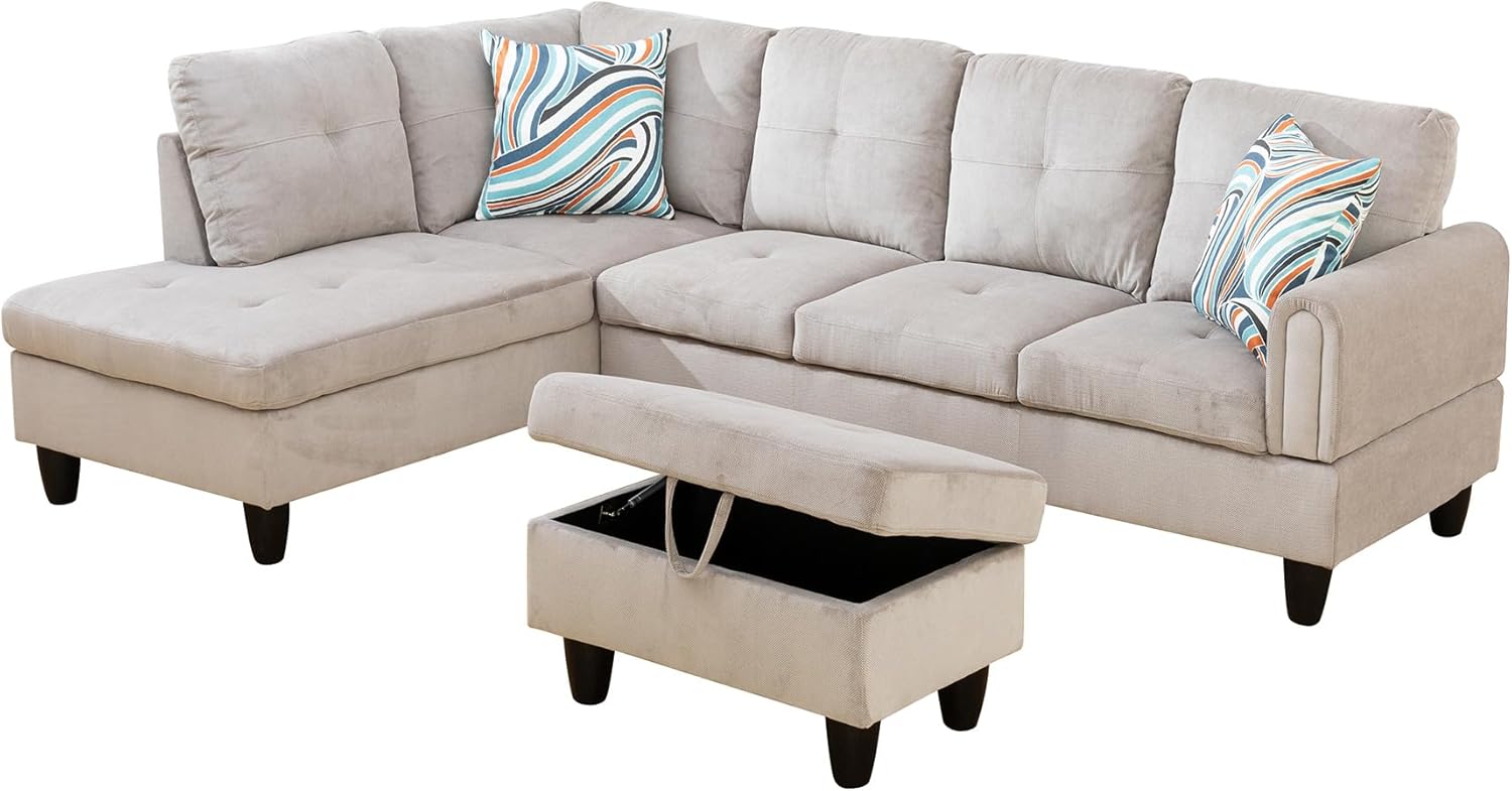 - Versatile and Practical Design: The chaise lounge setup allows for flexibility in your seating arrangement, enabling you to adjust the sofa to fit your space. The included storage ottoman adds functionality, offering a handy way to keep your living area neat and orderly.
