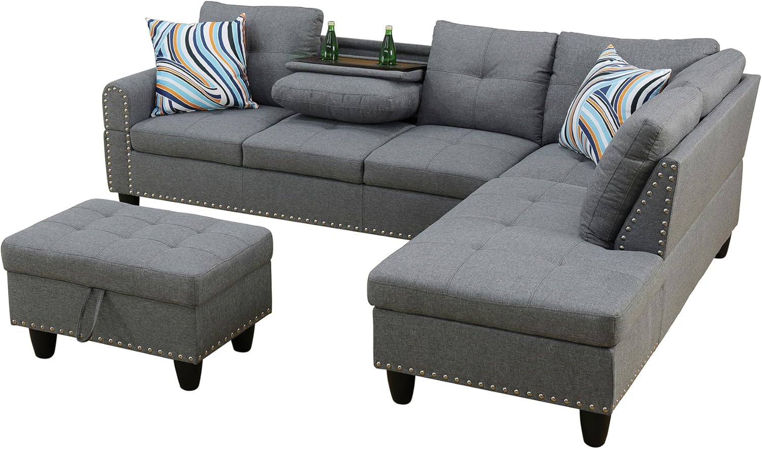 Couches for Living Room Modern L Shaped Couch Comfy Linen Fabric 3 Pieces Sectional Sofa with Chaise, Ottoman with Storage for Office and Small Apartment, Charcoal