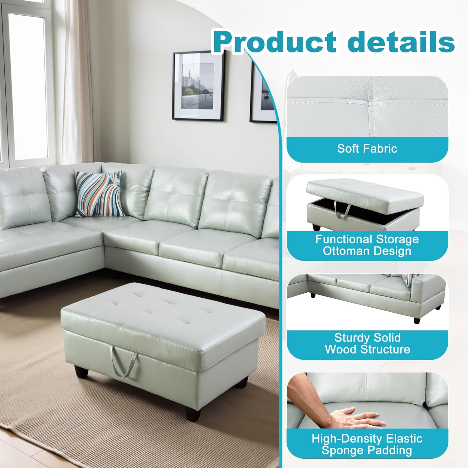 L Shaped Couch PU Leather Sectional Couch Upholstered 3 Pieces Sofas for Living Room with Chaise, Storage Ottoman for Office and Small Apartment, Silver Green