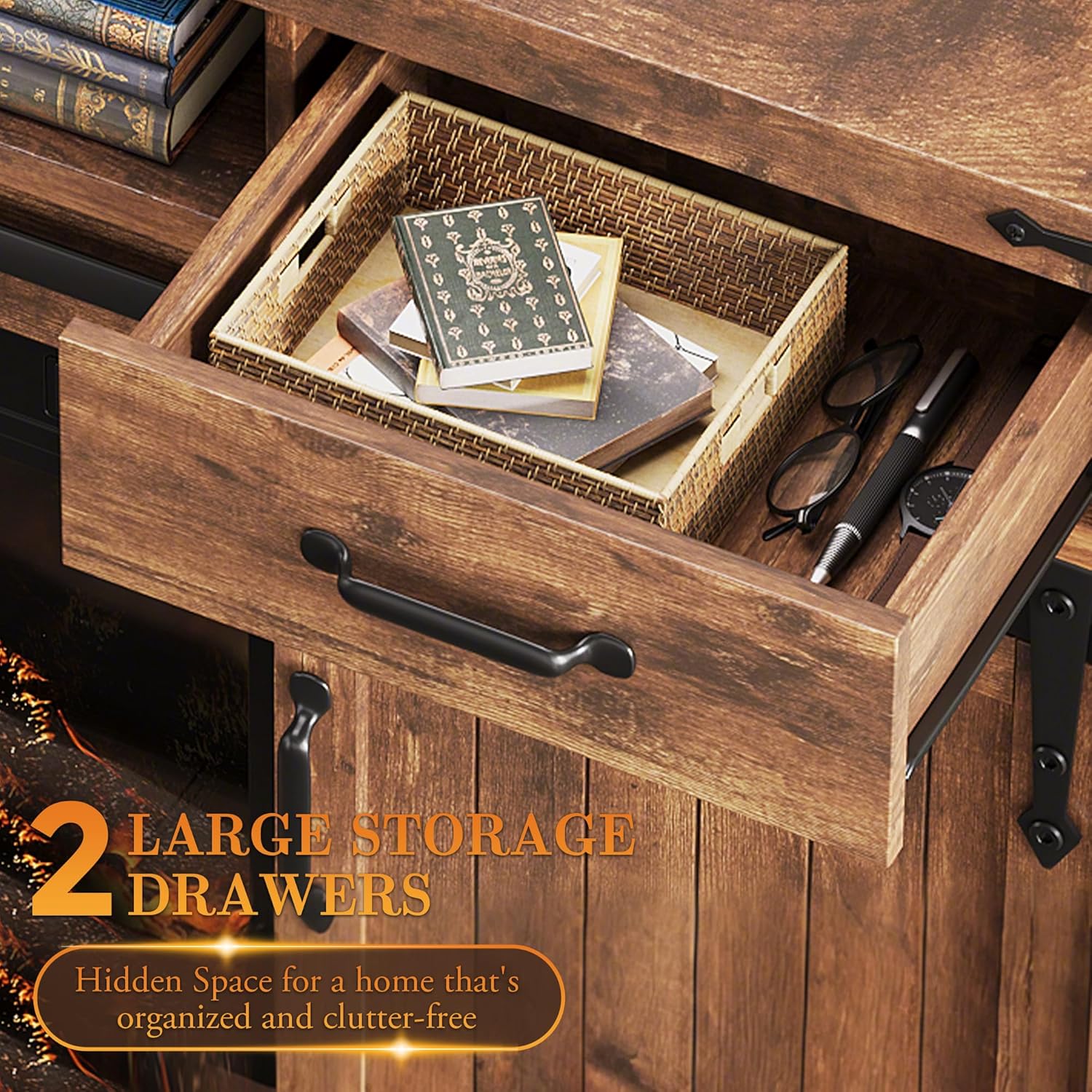 59'' Fireplace TV Stand with 3D Flame Electric Fireplace Heater, 34'' Tall Farmhouse TV Stand for 65 Inch TV, Entertainment Center TV Console with 2 Drawers, Sliding Barn Door for Living Room - Brown