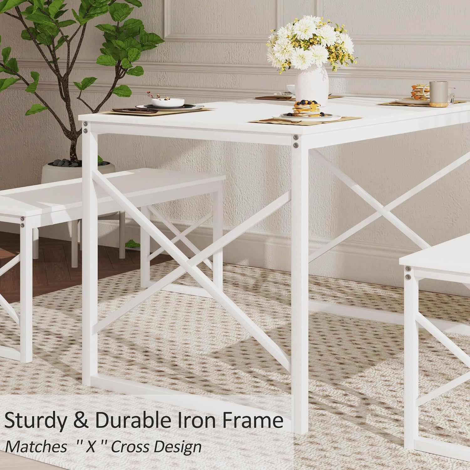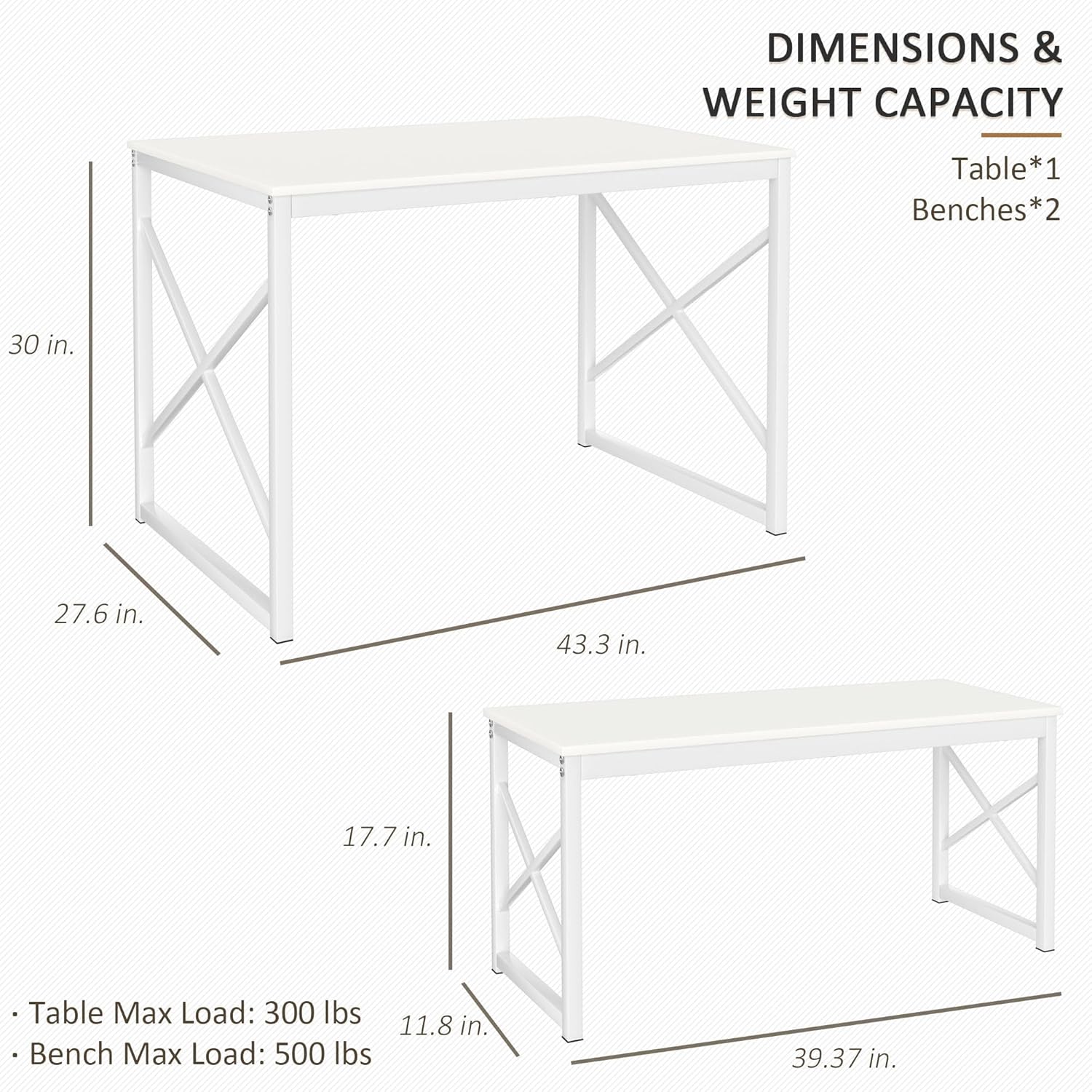 VECELO Dining Table with 2 Benches for 4, 43.3'' Wood Kitchen Room Dinette Sets with Metal Frame for Breakfast Nook and Small Space, White