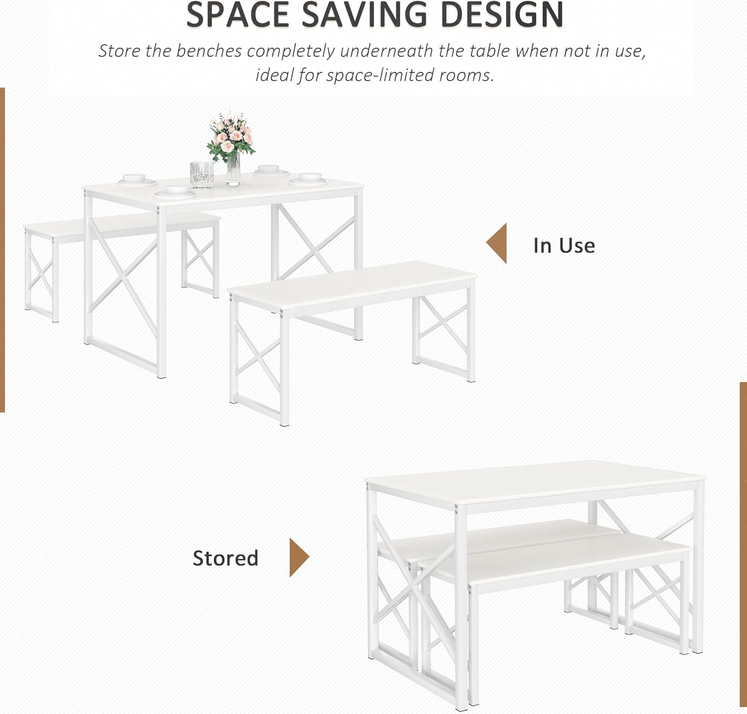 - Perfect for Small Spaces - This Dining Table Set includes a 43.3" long rectangle Table and 2 39.3" benches, designed specifically for small spaces. The bench can easily be completely stored underneath the table when not in use, saving you valuable space.
