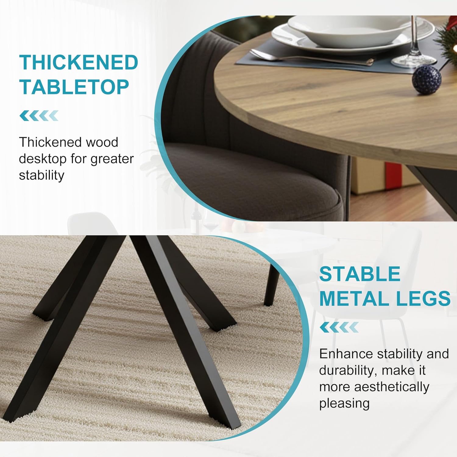 - Elegant Farmhouse Style: This wooden dining table for 4 features a simple yet elegant farmhouse-style design, adding a touch of rustic charm to your home. The contrast of the wood top and the metal base creates a warm and inviting atmosphere, perfect for any occasion.