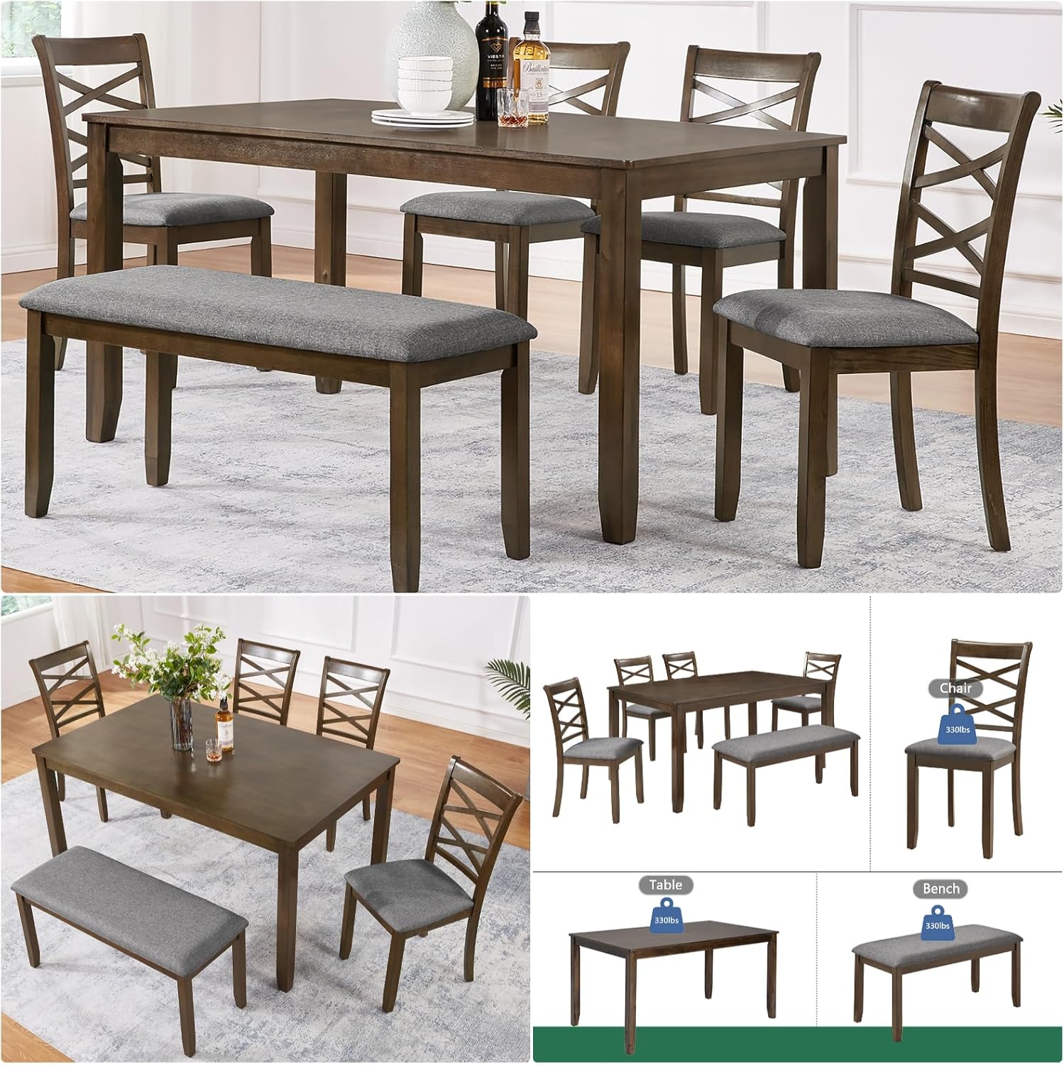 Dining Table Set, Wooden Kitchen Table Set with Rectangular Table, 4 Flat X Backrest Upholstered Chairs & a Bench, Table and Chairs with Non-Slip Feetmats for 6 People, Living Room, Walnut