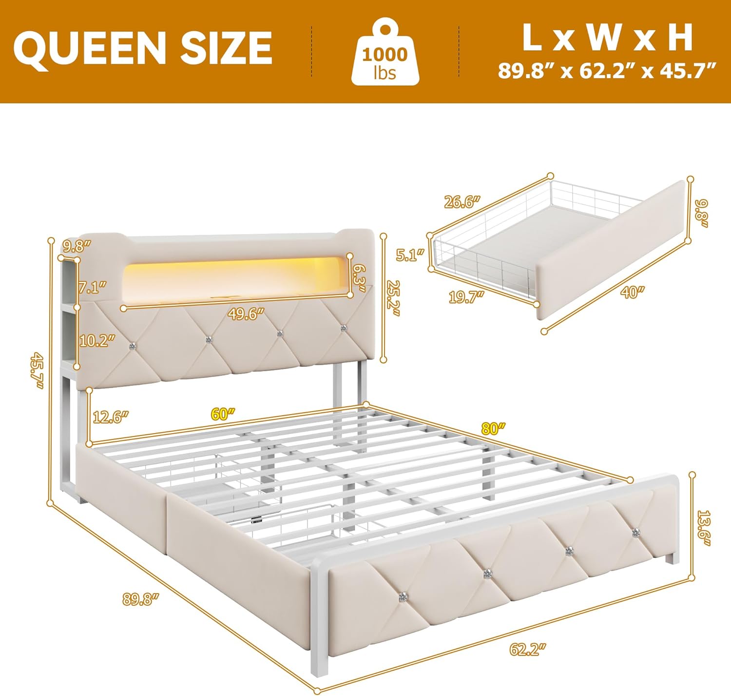 Queen Upholstered LED Bed Frame with 2 Storage Drawers and 2-Tier Storage Headboard,Velvet Princess Platform Bed with Charging Station & Bookcase, Corner Bed Frame, Heavy Duty Metal Support, Beige