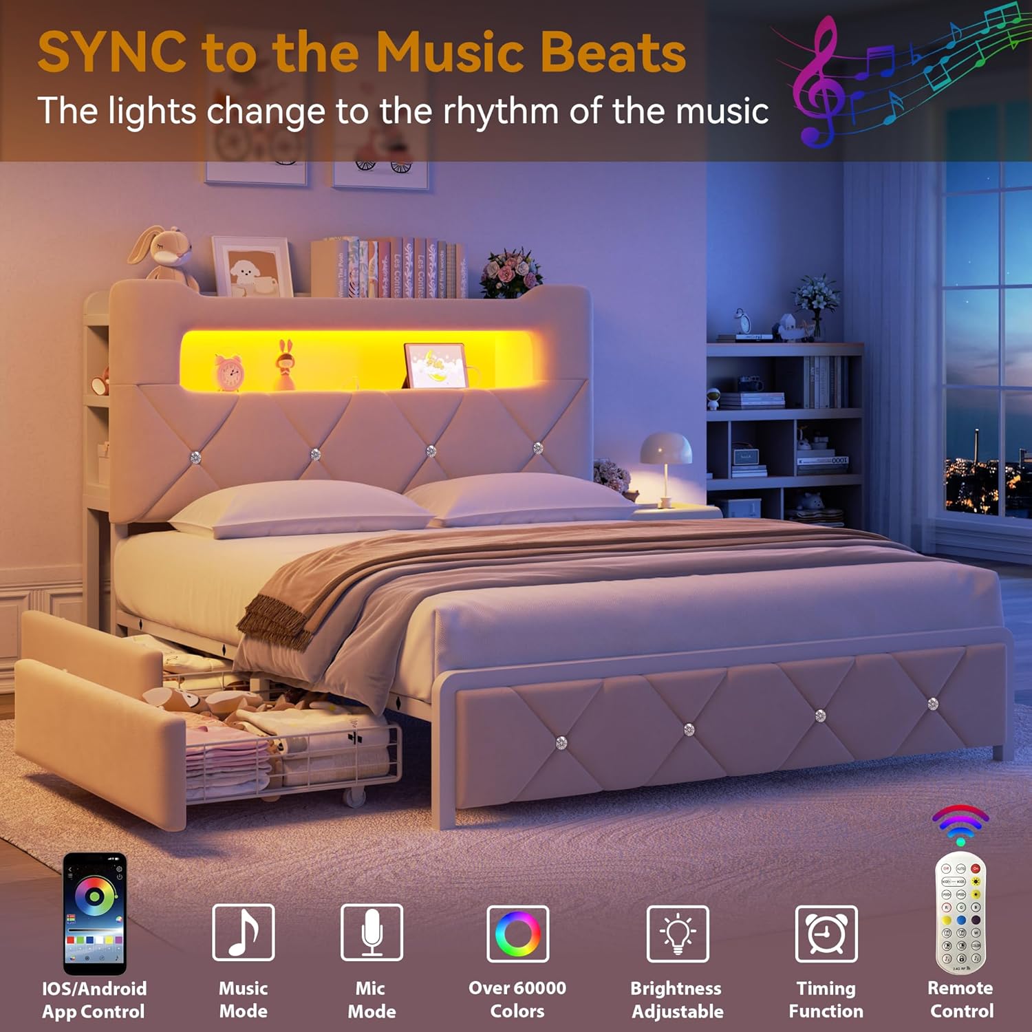 - SMART RGB LIGHTS WITH MUSIC SYNC: This queen bed frame with built-in RGB LED headboard transforms your bedroom with over 16 million colors, 20+ light effects, and dynamic modes controlled by app or remote. Bold lights sync with music, setting the ideal vibe for relaxing, reading, or entertaining. From gentle nightlight for kids to vivid party colors, this velvet bed frame makes every moment magical with immersive ambiance
