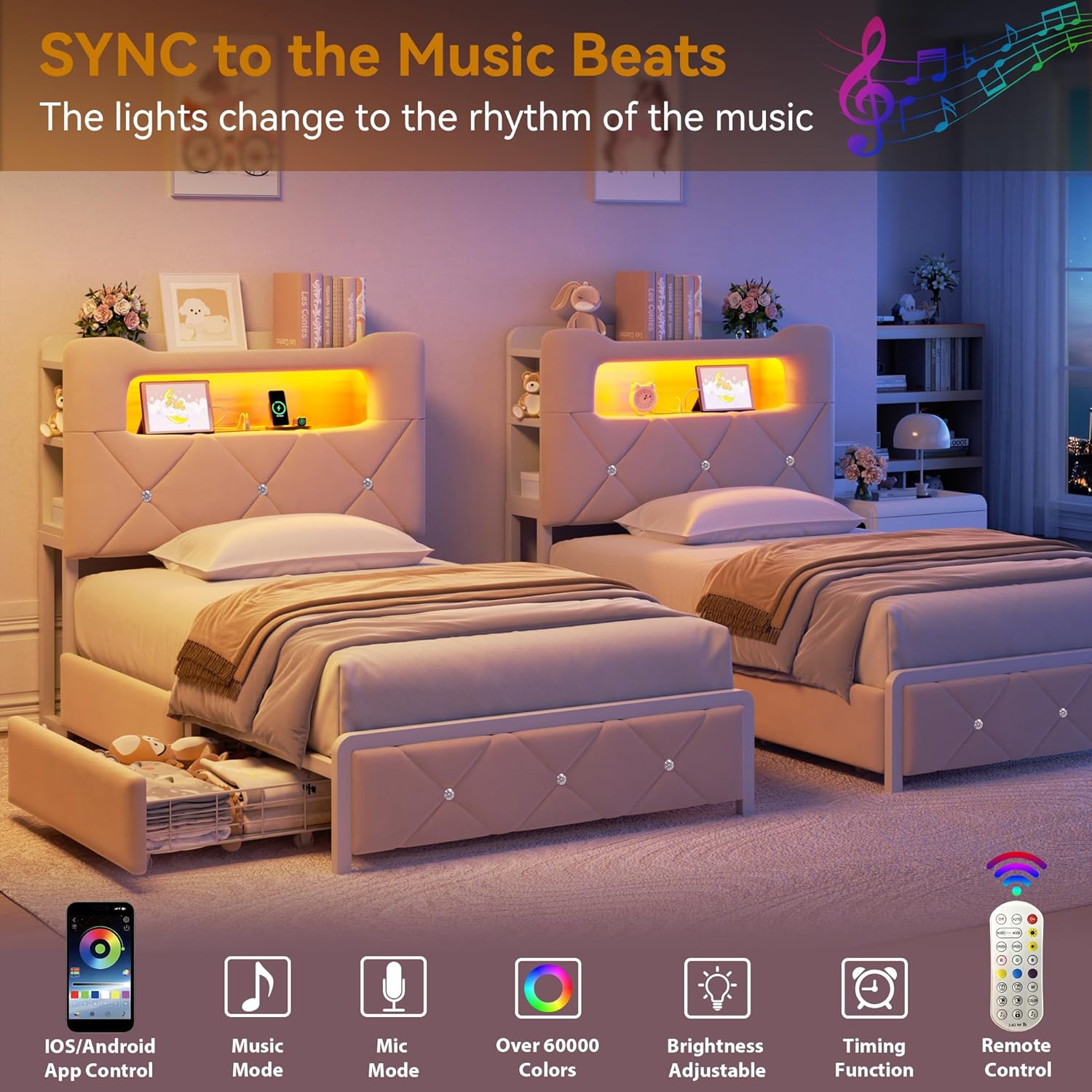 - SMART RGB LIGHTS WITH MUSIC SYNC: This twin bed frame with built-in RGB LED headboard transforms your bedroom with over 16 million colors, 20+ light effects, and dynamic modes controlled by app or remote. Bold lights sync with music, setting the ideal vibe for relaxing, reading, or entertaining. From gentle nightlight for kids to vivid party colors, this velvet bed frame makes every moment magical with immersive ambiance
