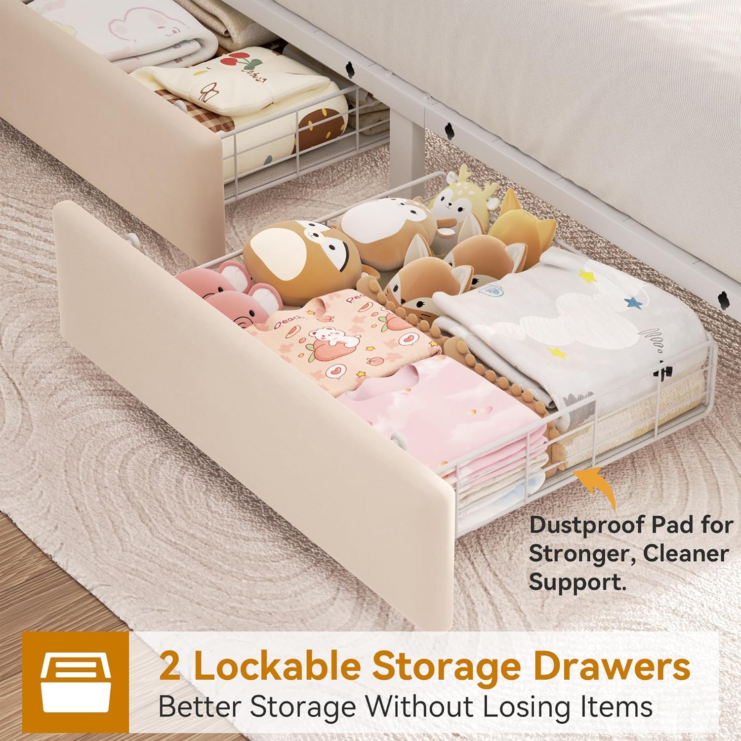 - TWIN BED FRAME WITH STORAGE DRAWER: This beige twin size bed frame maximizes space with two large, silent-glide drawer for easy storage. The locking design keeps drawers securely in place, while the bottom dust mats offer cleaner and stronger support. With 9.8 inches of clearance, this twin bed frame offers extra space for storage and easy cleaning, plus the air circulation keeps the mattress fresher for longer