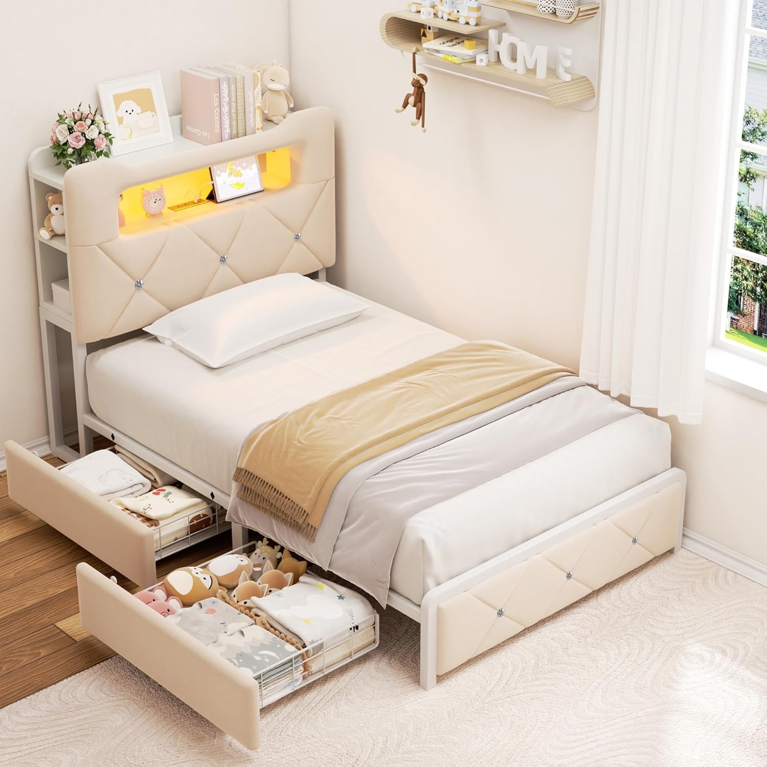 Twin Upholstered LED Bed Frame with 2 Storage Drawers and 2-Tier Storage Bookcase Headboard, Velvet Princess Platform Bed for Kids/Girls/Boys, Corner Bed Frame, Heavy Duty Metal Support, Beige