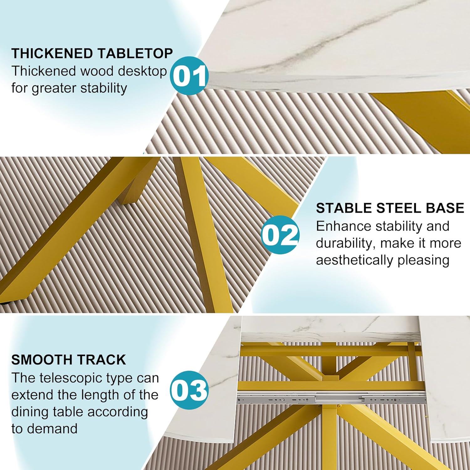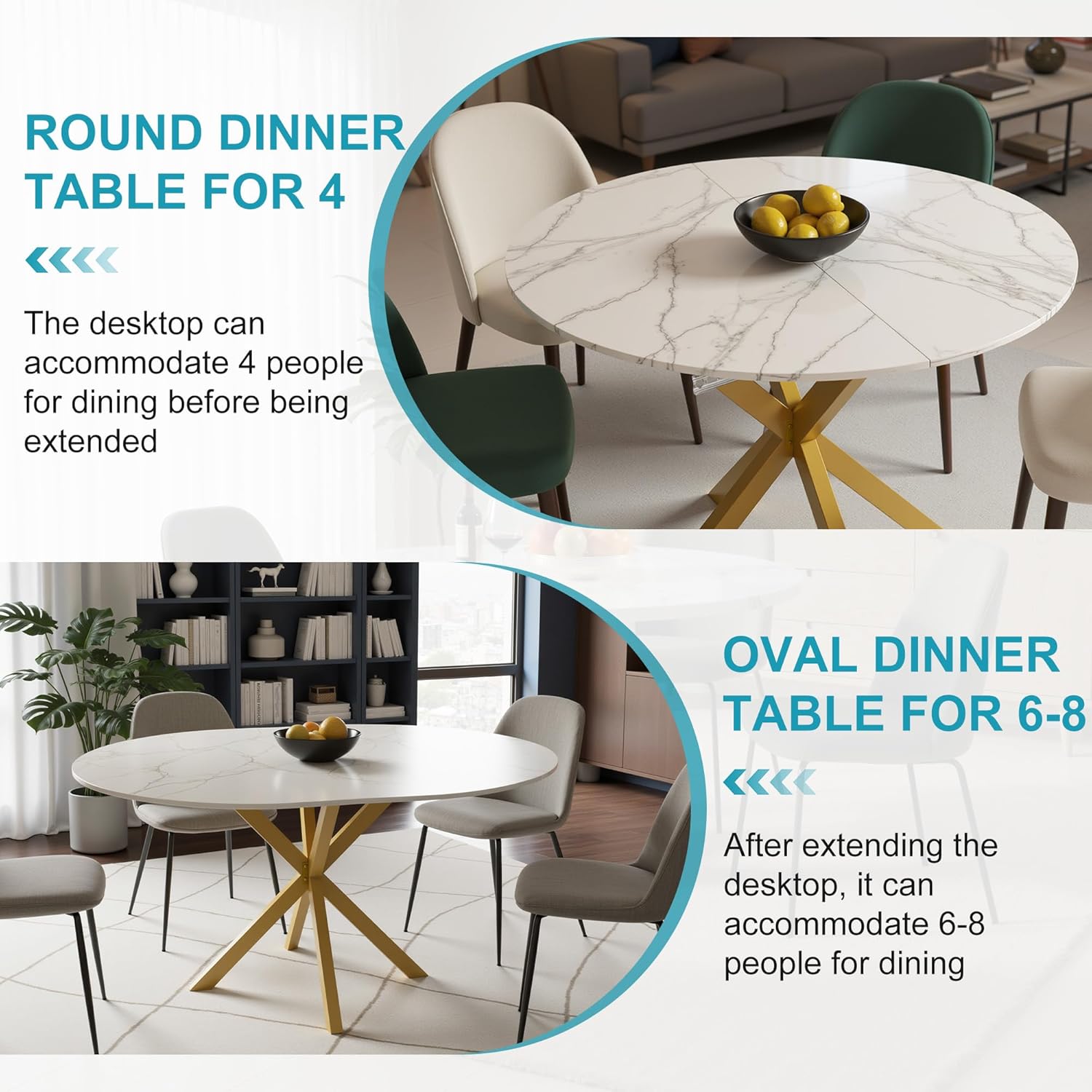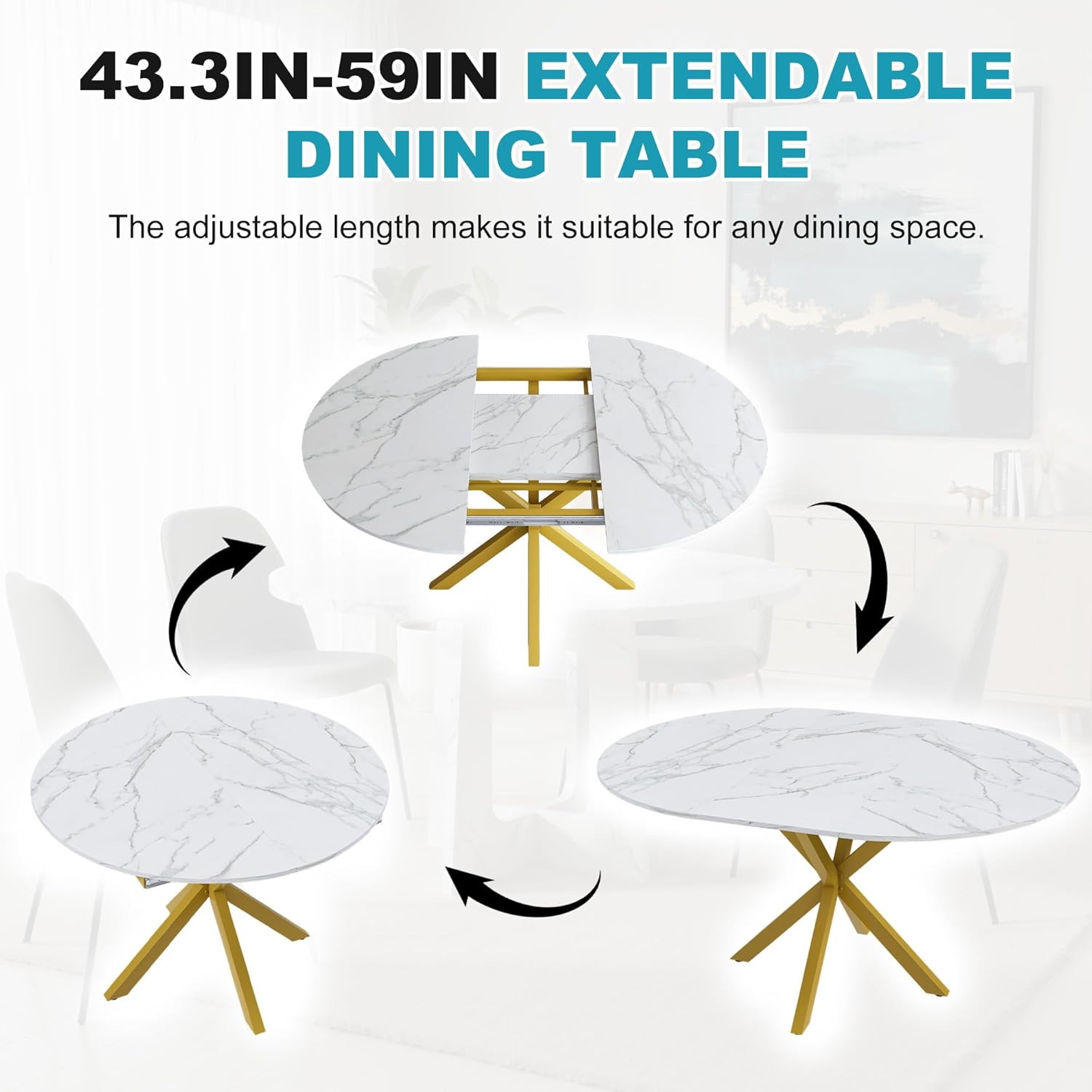 43"- 59" Extendable Dining Table for 4-6, Retractable Round Dinner Table Marble Oval Kitchen Tables Modern Steel Base Dining Room Tables for Small Space, Kitchen, Living Room, White & Gold