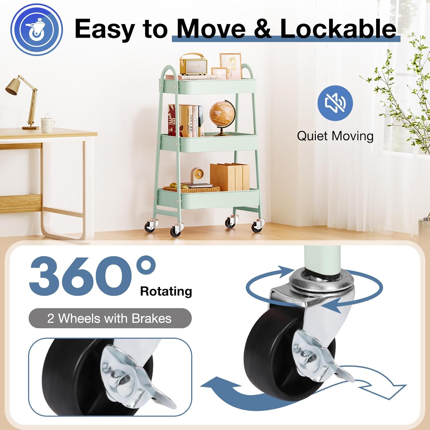 OLIXIS 3 Tier Utility Rolling Cart with Lockable Caster Wheels, Metal Mobile Storage Shelf, Organization for Livingroom, Bathroom, Kitchen, & Narrow Places, Pale Green