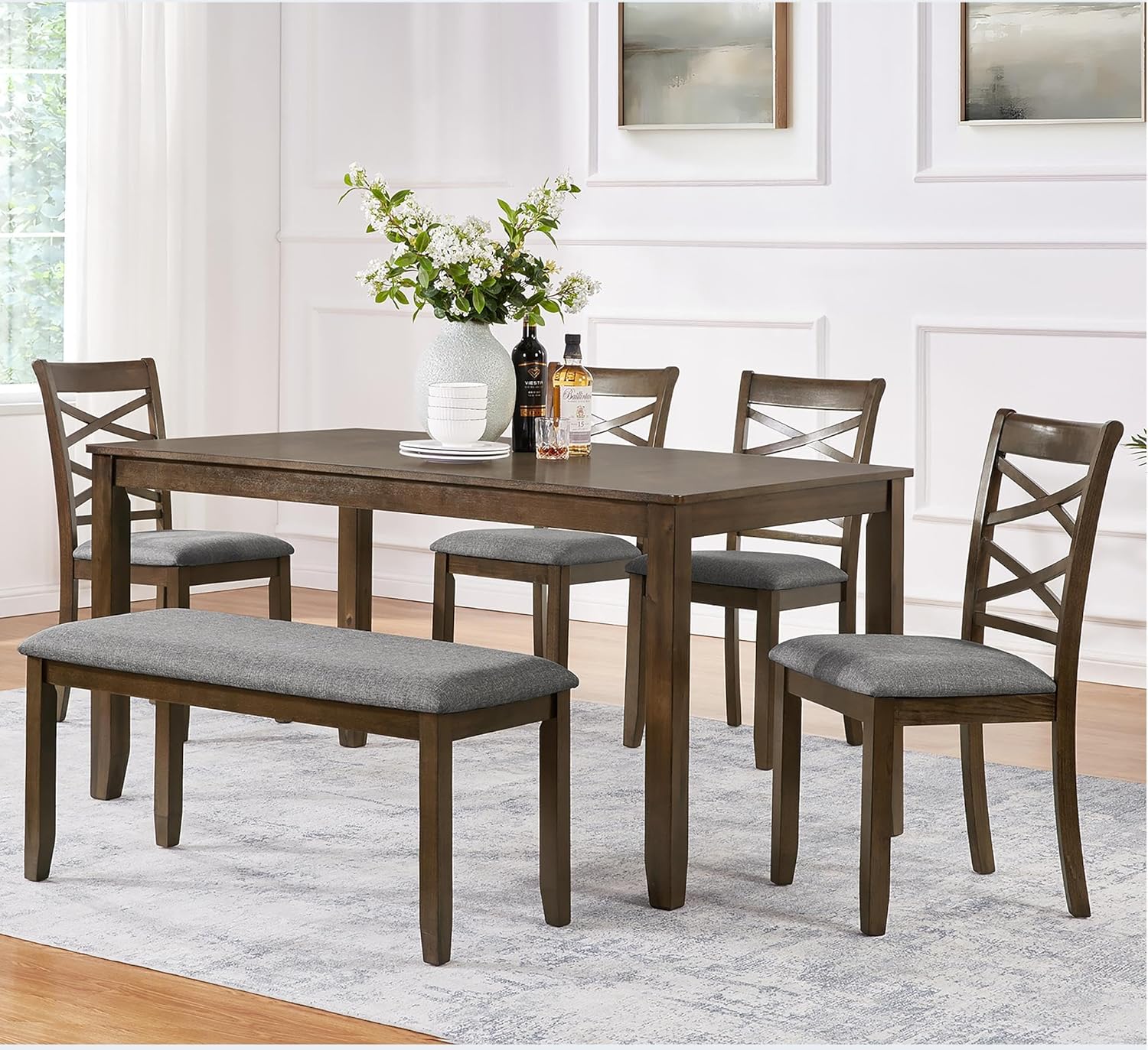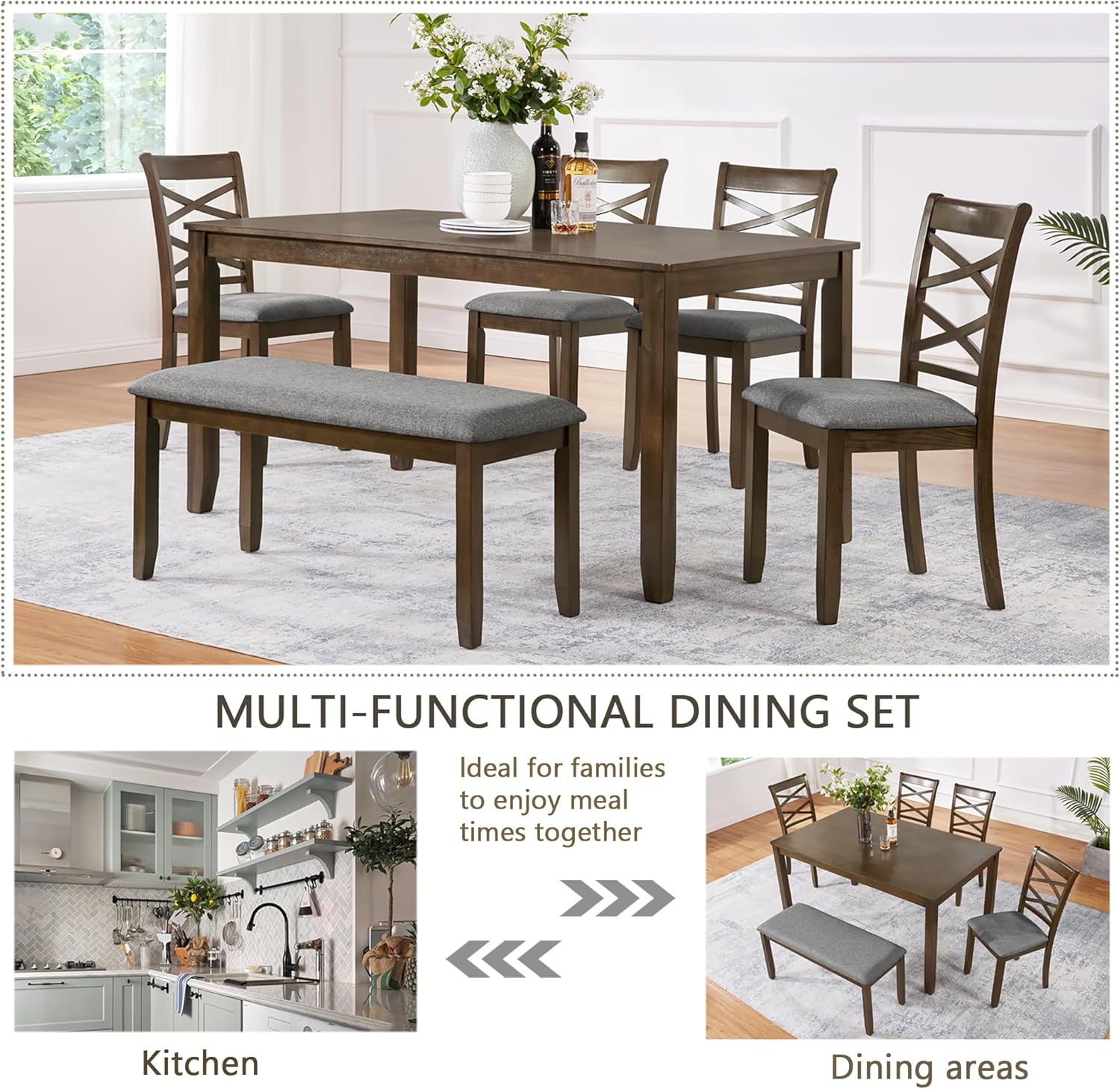 soges 6 Piece Kitchen Dining Set, Rectangular Wooden Dining Table with 4 Upholstered Chairs and a Bench, Morden Dining Table Set for 6 People, Living Room, Home Bar and Kitchen, Walnut