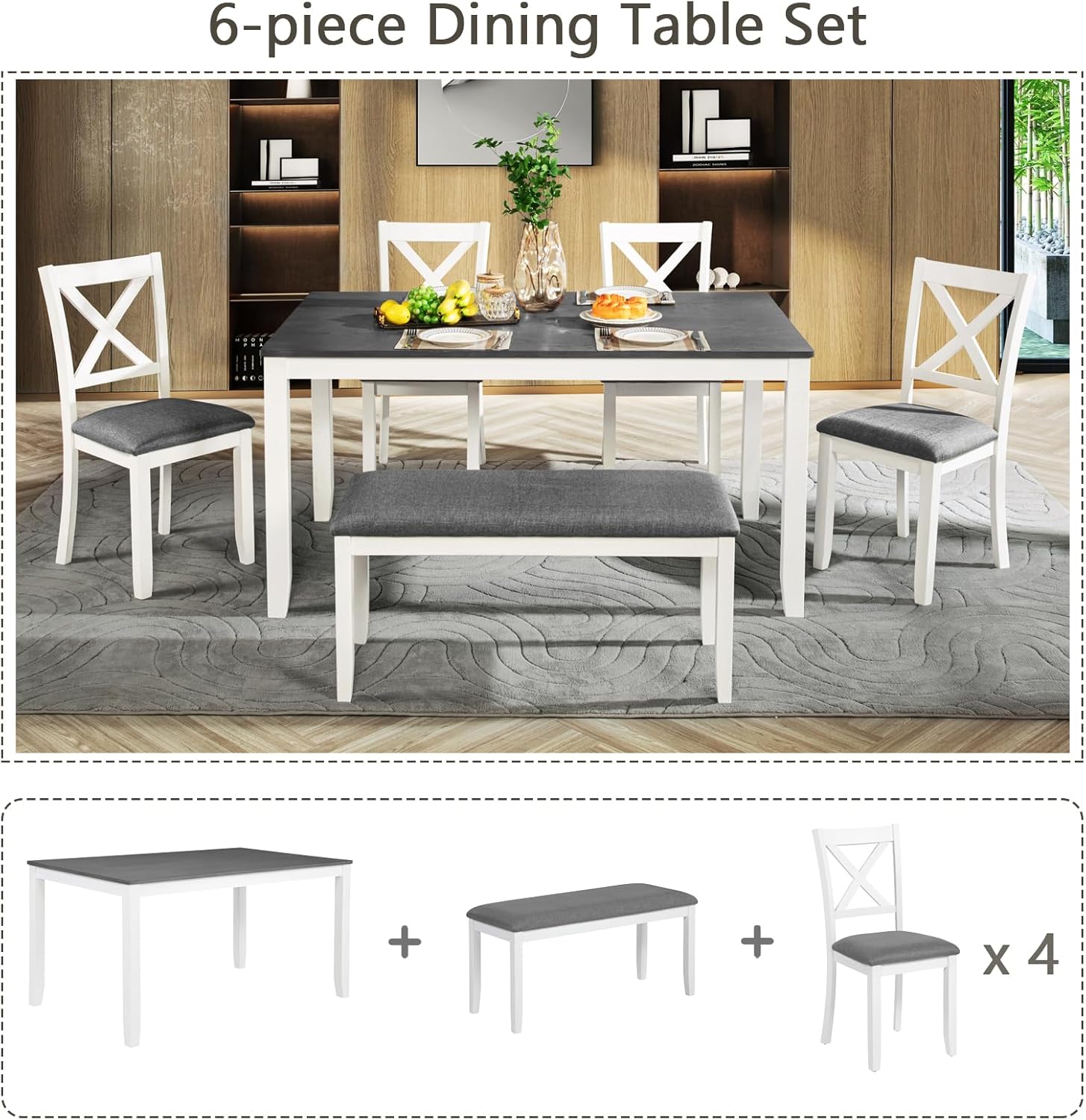soges 6-Piece Kitchen Dining Table Set with Bench, Wood Dining Table Set for 6, Modern 6-Person Table Set for Dining Room, Kitchen, Grey & White
