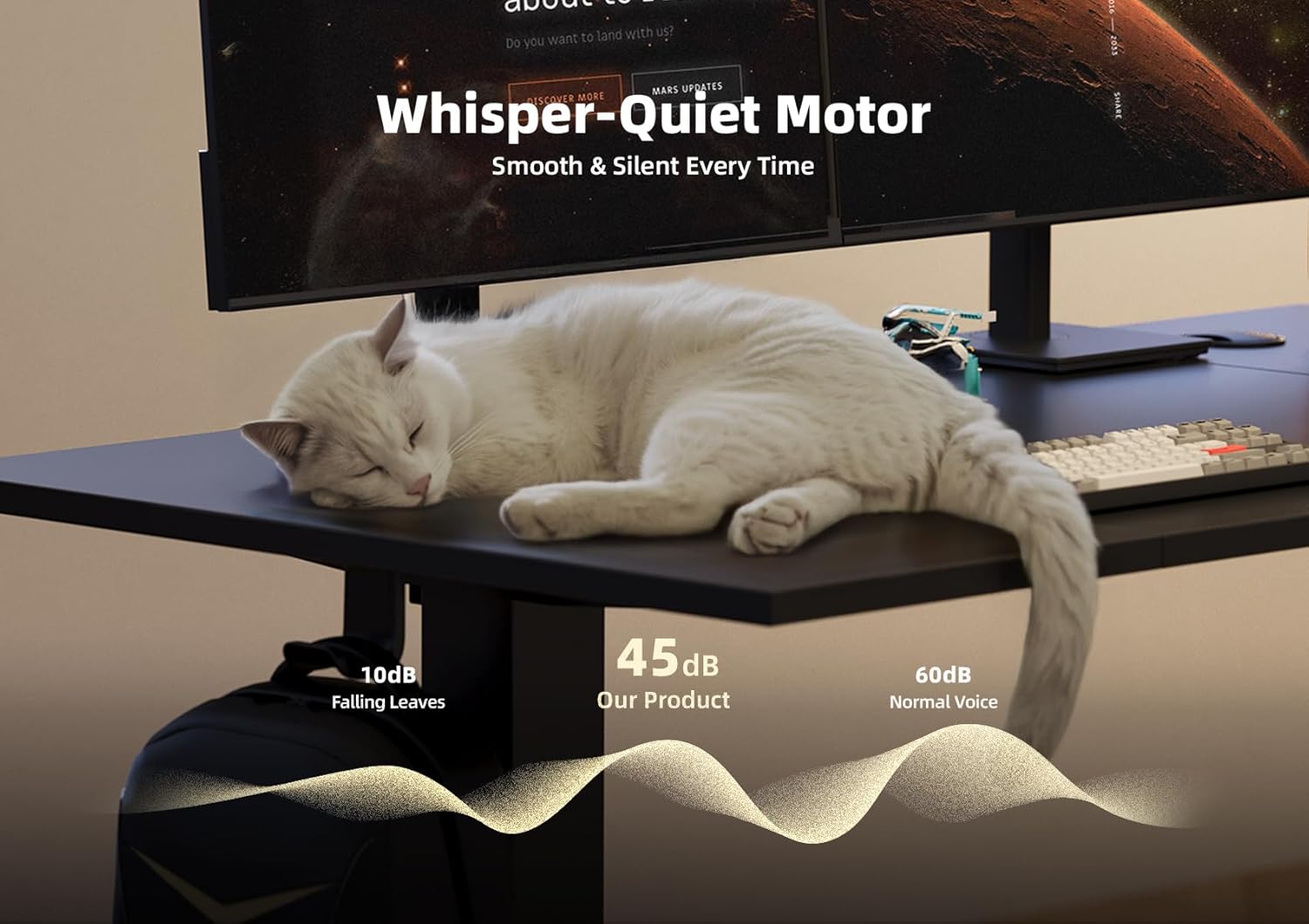 - Smart Electric Lift: Seamlessly adjusting from 28.3 inches to 46.5 inches, this adjustable desk is perfect for any situation - whether it's work, study or meetings. The whisper-quiet motor operates at under 45dB, so you can stay focused and undisturbed throughout the day.