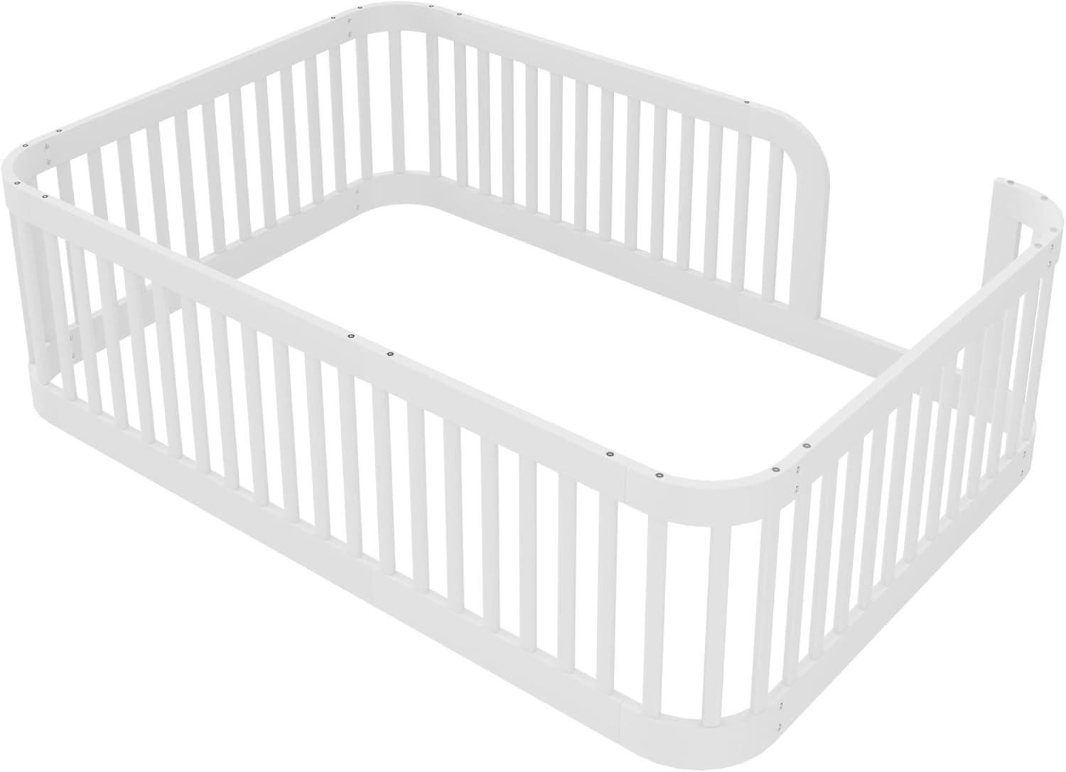 Full Floor Bed with High Fence and Rounded Corner Design, Montessori Floor Bed Frame with Guardrail and Entrance, Easy Assemble Montessori Bedd Full Size, White