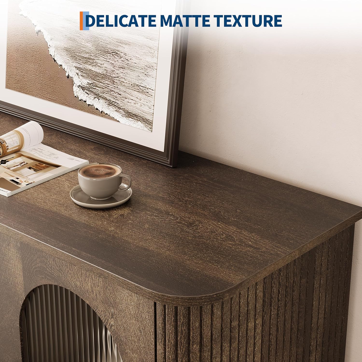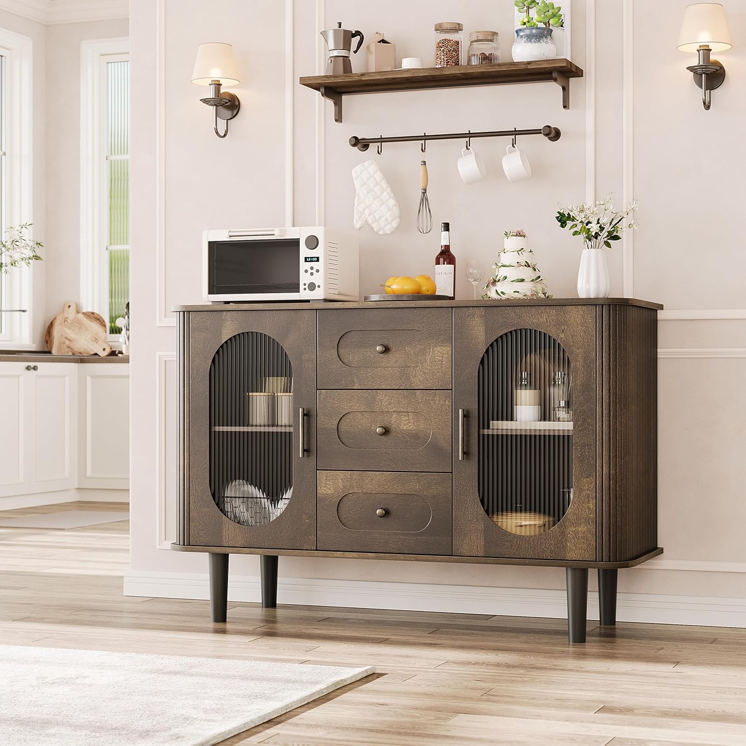 - 【Elegant Fluted Glass Doors】: This kitchen buffet cabinet features elegant fluted glass doors. The upgraded embedded silicone shell process is more attractive and secure than traditional glass glue and clips. The glass panels are removable and replaceable for added convenience. Ideal as a coffee bar cabinet or kitchen buffet bar storage cabinet, it beautifully displays your favorite glassware and décor while keeping items dust-free